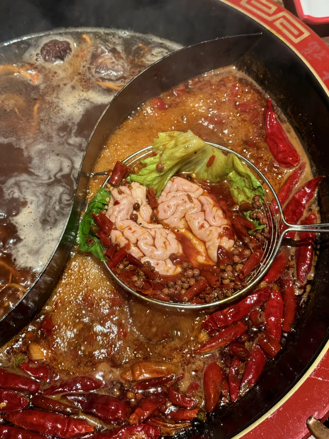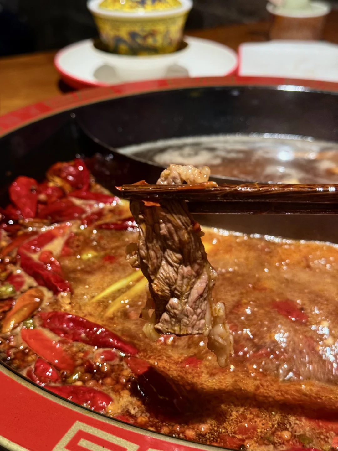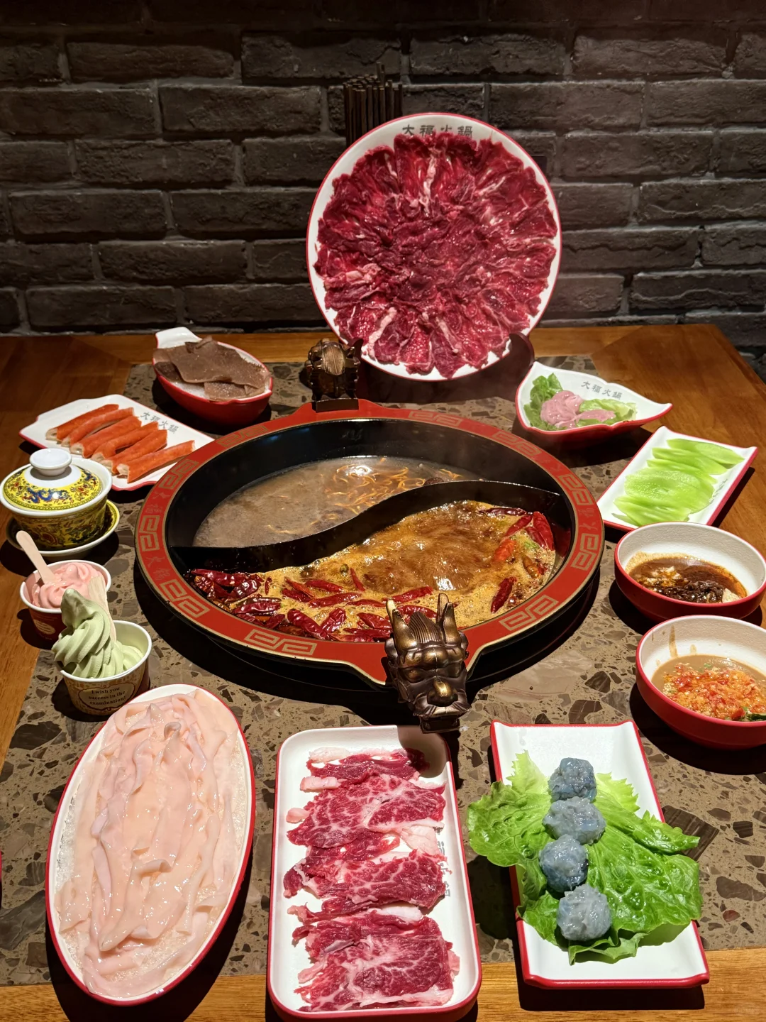 · 🔥冬天就得吃火锅 火锅就🉐吃重庆的! 😁这家火锅店已经n刷了~ · 🏮装修浓浓的喜庆感,烟火气十足 👏店里的毛笔字 超接地气~ · ✅我们点了麻辣➕菌汤锅底 🌟菜品点了毛肚、吊龙、雪花、鹅肠、猪脑、蟹棒、虾滑…食材新鲜~ 🤩正宗的重庆锅底 再加上酱料! 🉑真的ju好吃! · 🥹而且~他家冰淇淋任吃!糖水任吃 😋太满足啦~ · 📍山峸大福火锅 ⏰11:00~02:00 ·
