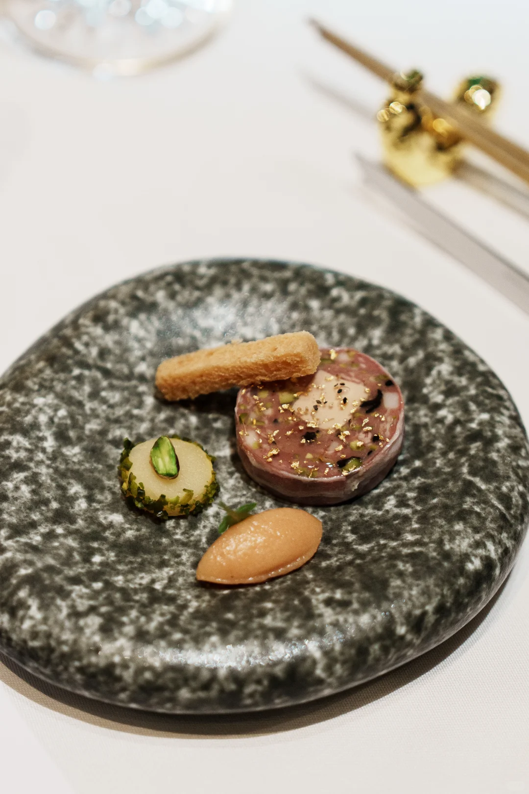 醇厚的野味肉酱搭配榅桲酸甜与开心果脆感,像是家常肉酱面包的高级版。佐以黑醋栗金桔苹果气泡饮,清爽解腻。