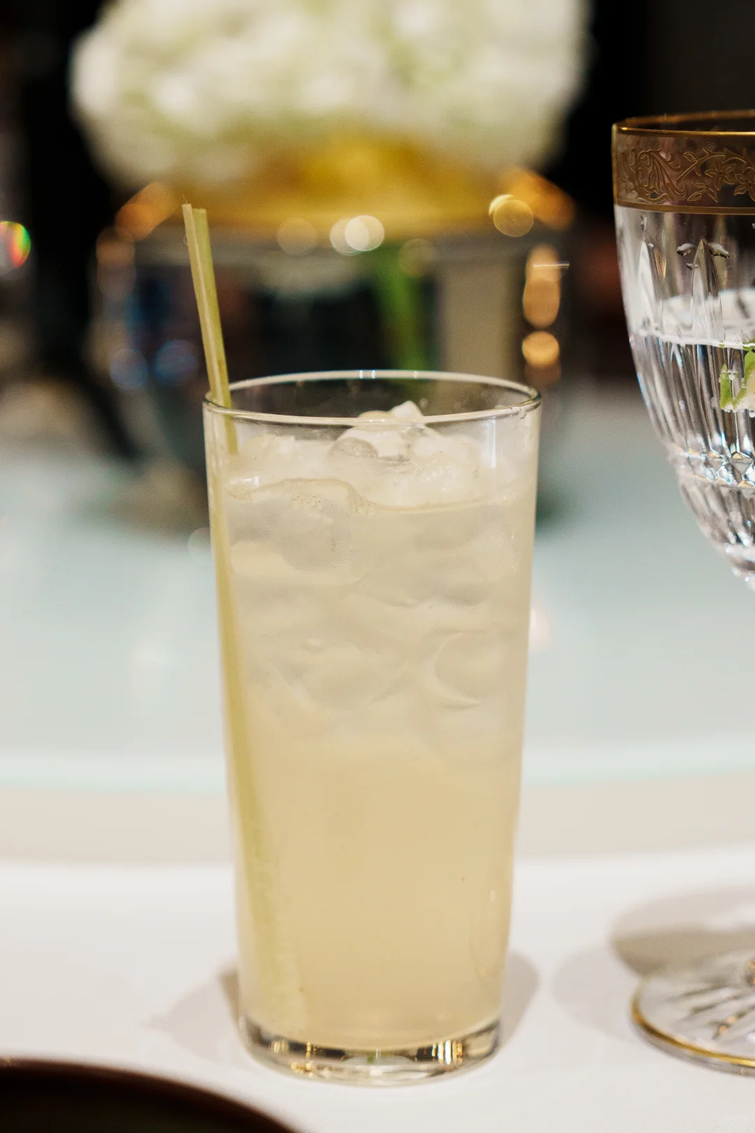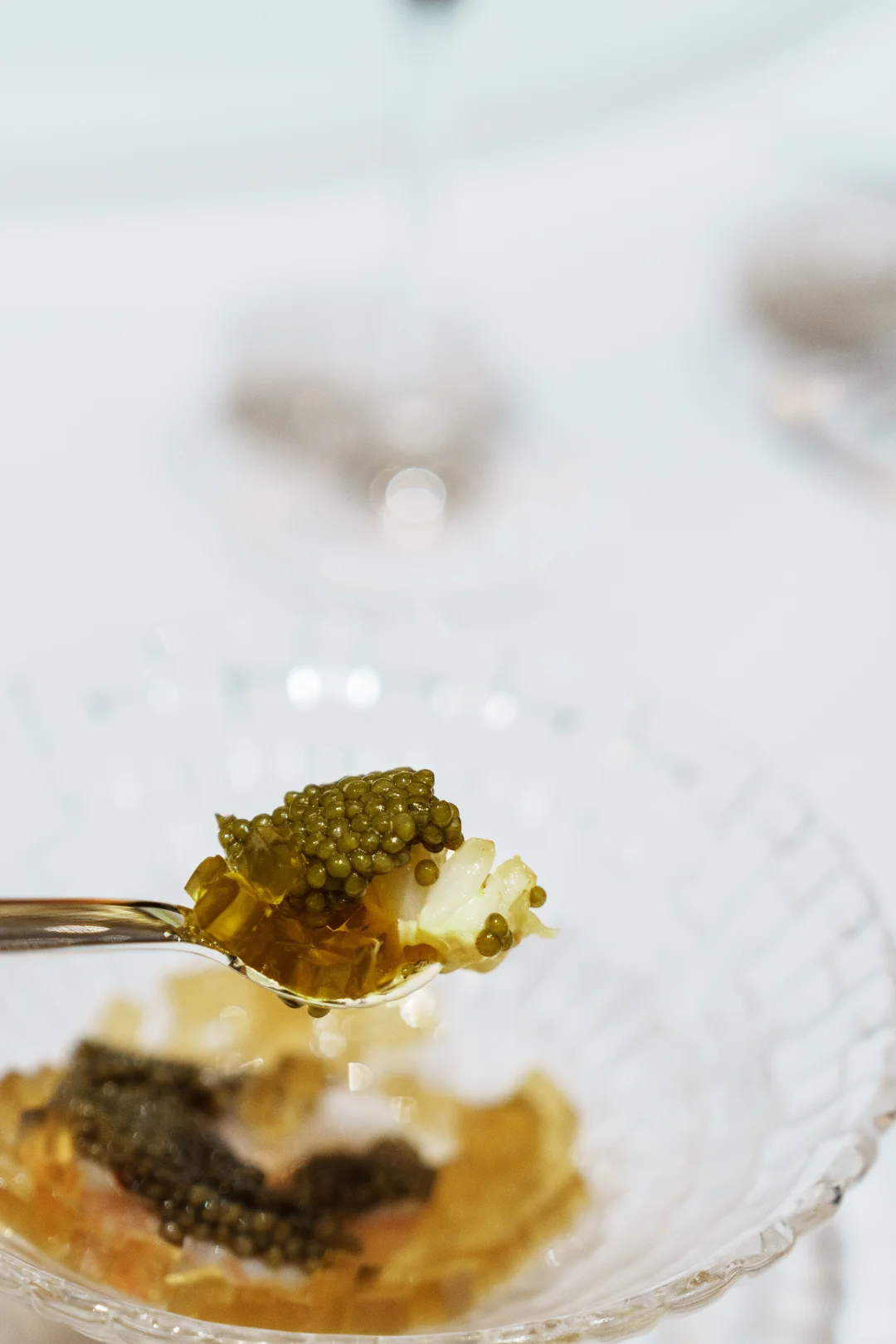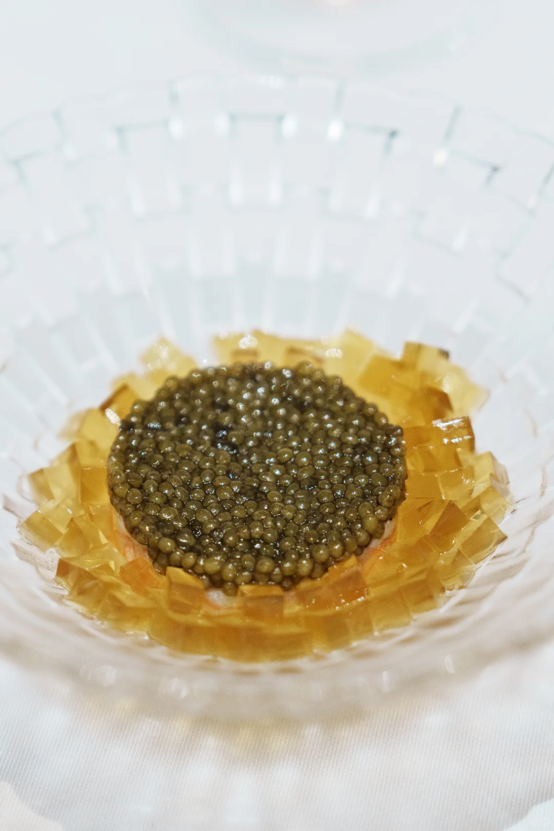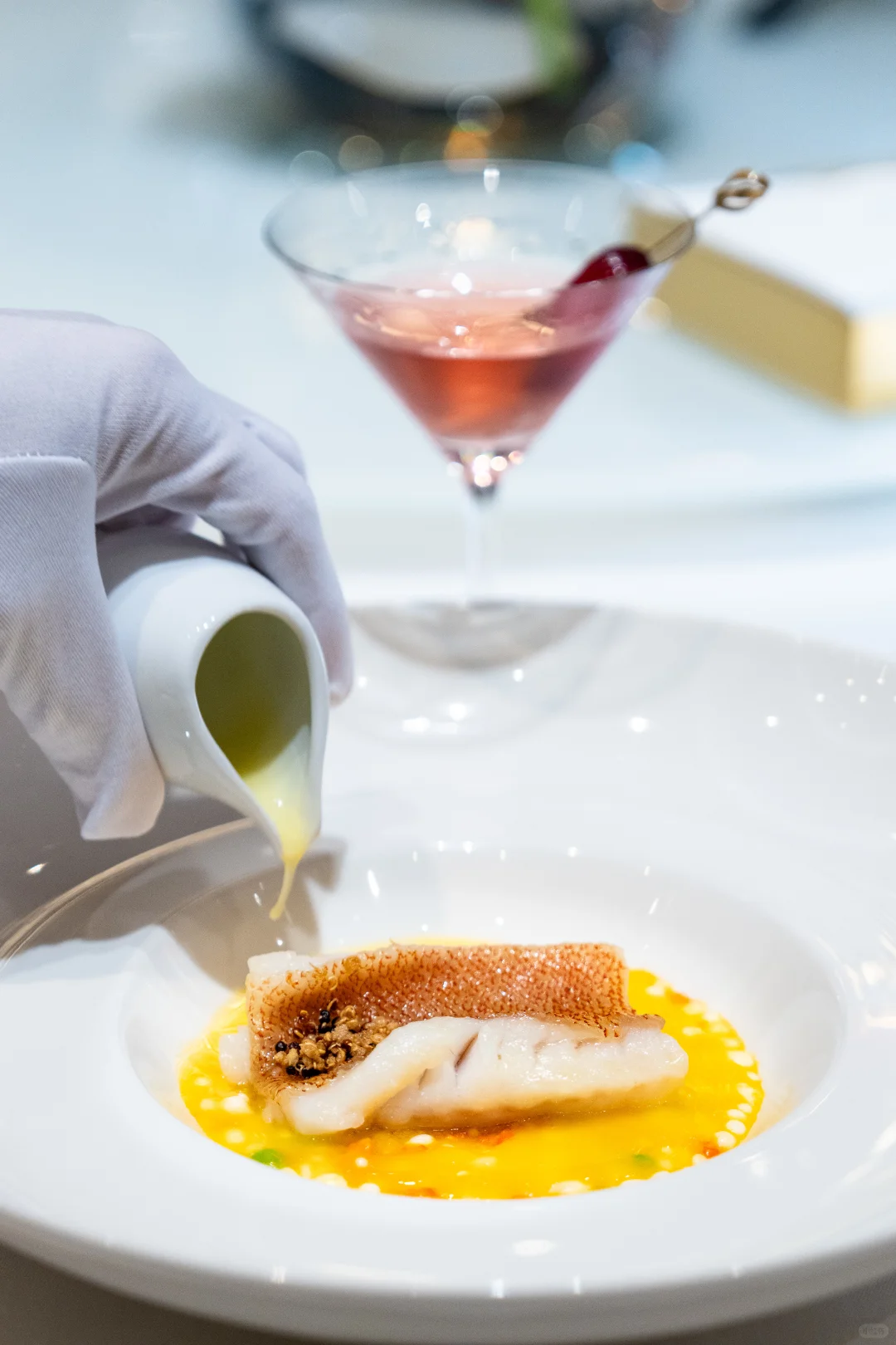 半熟海螯虾细滑鲜甜,鱼子酱咸鲜带奶香。藏红花鱼冻清新柔和,配微辛无酒精调饮,一口鲜味恰到好处。