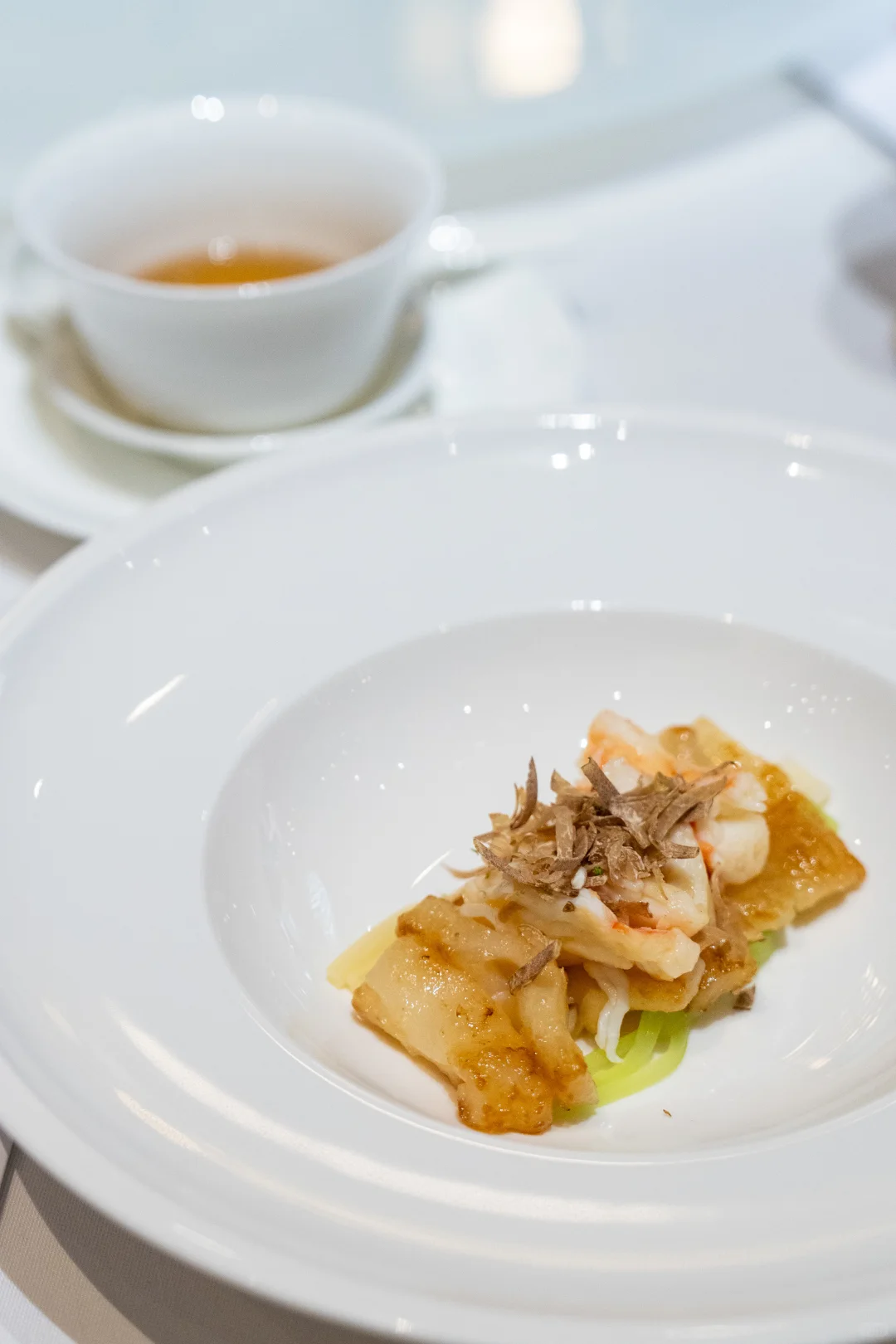白松露香气主导,花胶弹嫩、蟹肉清甜。整道菜如一碗奢华海鲜羹,鲜甜中带高雅气息。