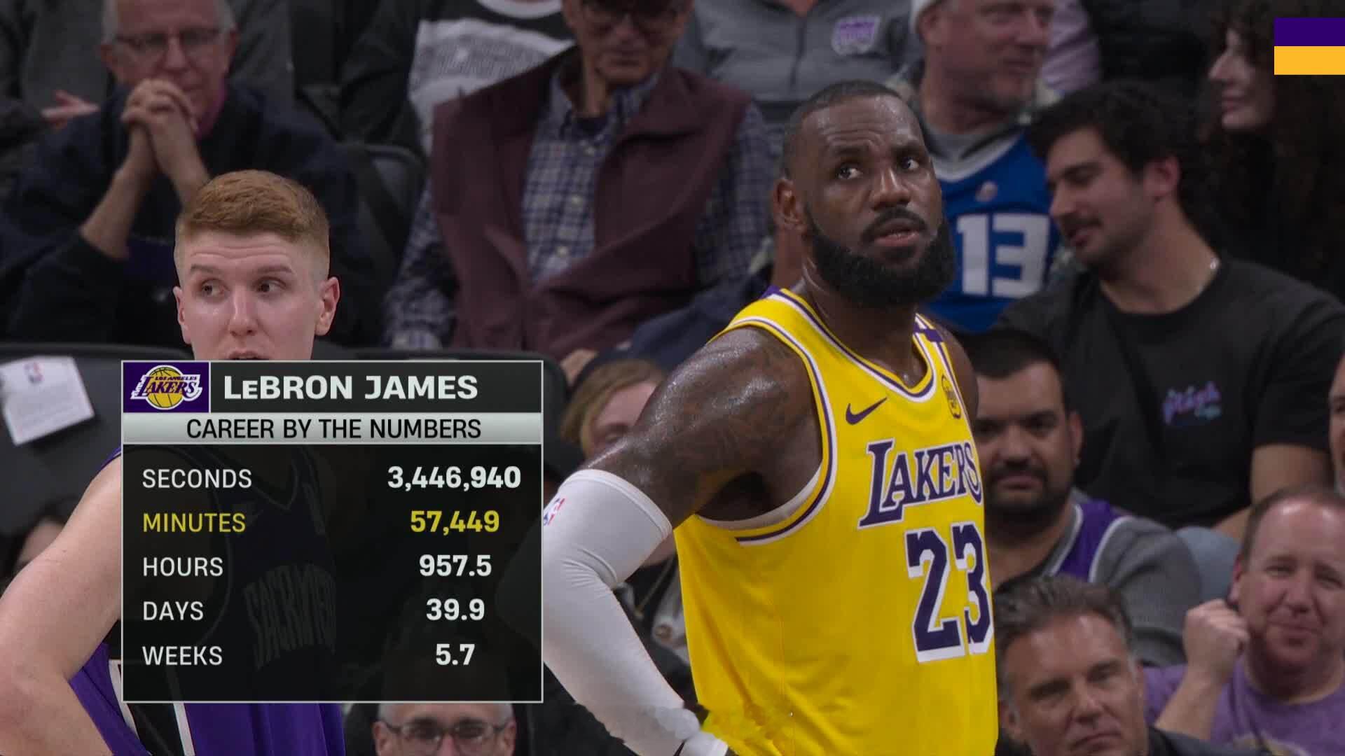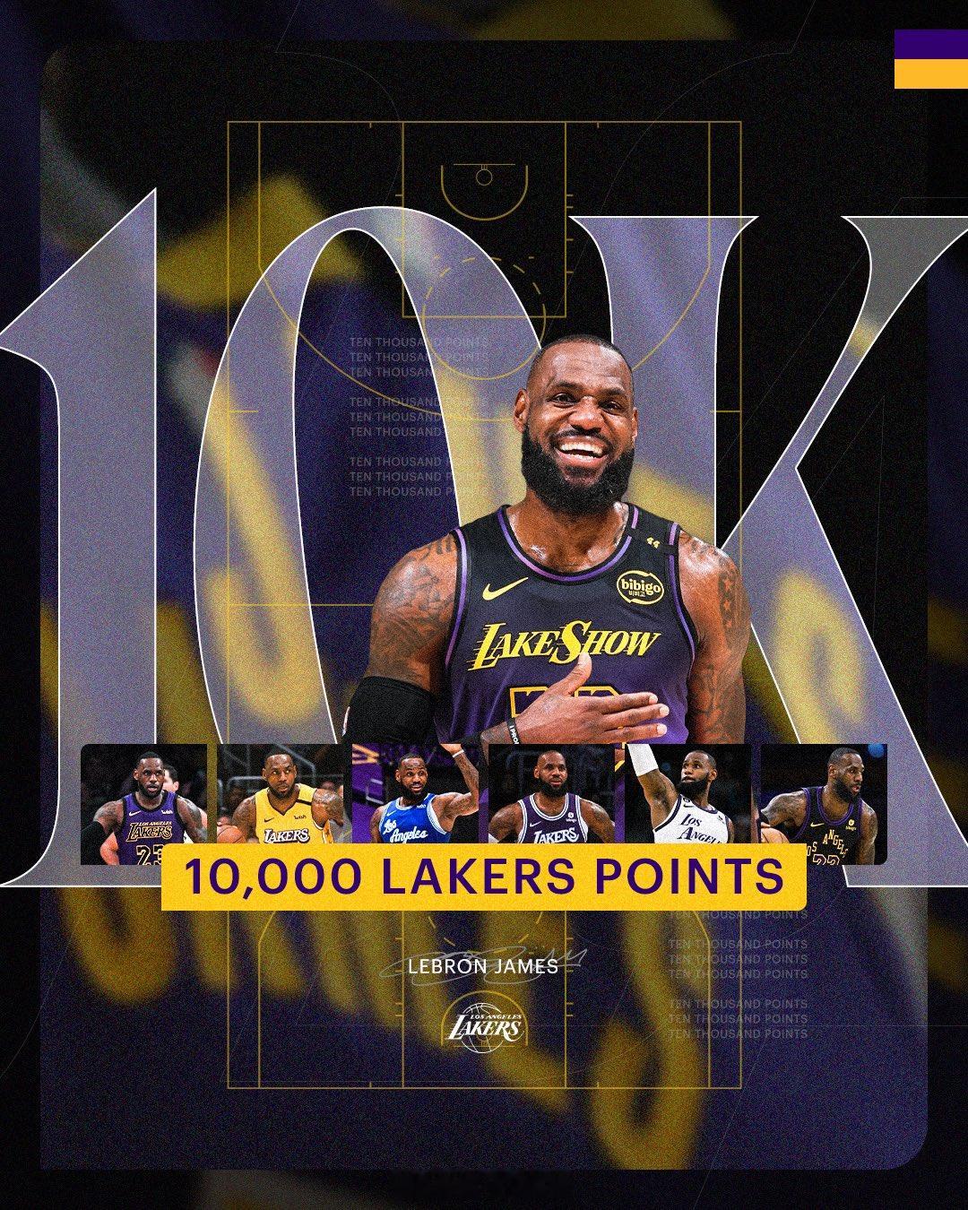 出场34分钟的詹姆斯成为NBA历史出场时间最多的球员,同时他在湖人生涯的总得分已突破10000分。