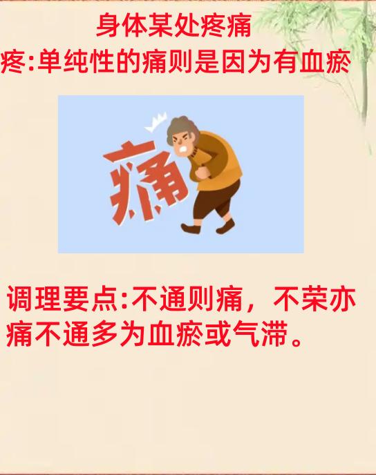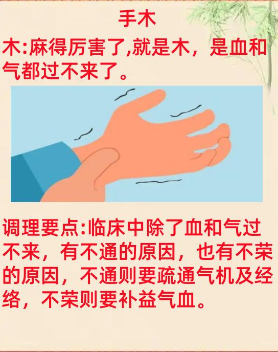 中医小知识,麻木酸胀疼,是身体的预警 手麻:表明气能过来,而血过不来。 手木:麻得厉害了,就是木,是血和气都过不来了。 腰部或肩部酸痛:表明经络是通的,但是气血不足。 肚子里面感觉胀:表明气很足,此类人是爱生气的体质,若体内的气出不去就胀。 感觉身体某处疼痛:单纯性的痛则是因为有血瘀。
