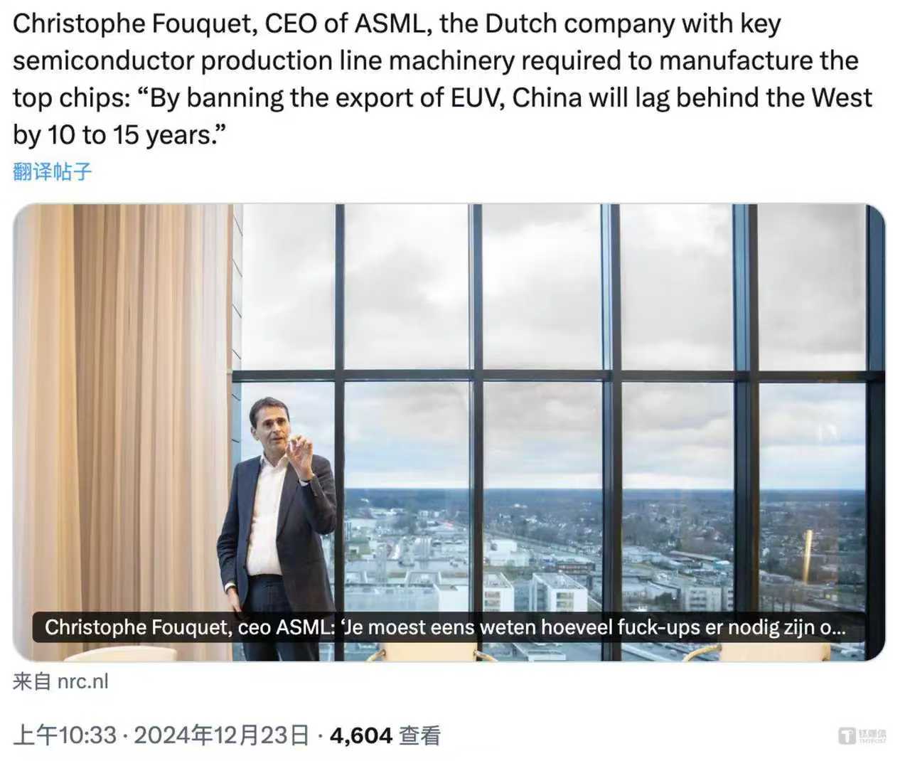 荷兰ASML公司作为芯片光刻机领域的翘楚,其首席执行官克里斯托夫·富凯(Christophe Fouquet)近期对中美半导体行业发展发表了相关看法。据荷兰《新鹿特丹报》(NRC)12月26日消息,富凯表示,由于美国禁止向中国出口EUV光刻设备,相较于英特尔、台积电和三星等行业巨头,中国芯片技术将落后西方10至15年。他指出,美国禁令影响显著,因经营一家成功的芯片工厂不仅需要资金,更需长期投入研究、持续学习与尝试,而获取尖端光刻机受限无疑是一大阻碍。