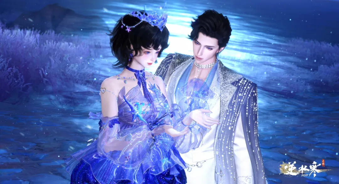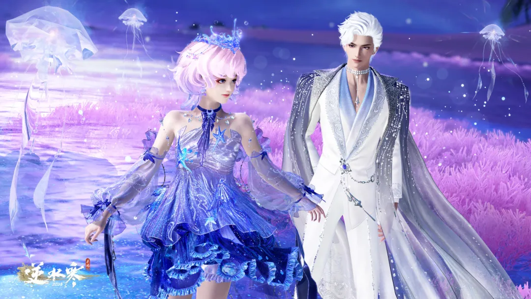 设计时,《逆水寒》手游的团队充分汲取了水母纤细、轻盈、透明的特点,女款时装裙摆上,水母游曳的身影栩栩如生,细节处 “黑科技” 满满,材质更是如梦似幻。