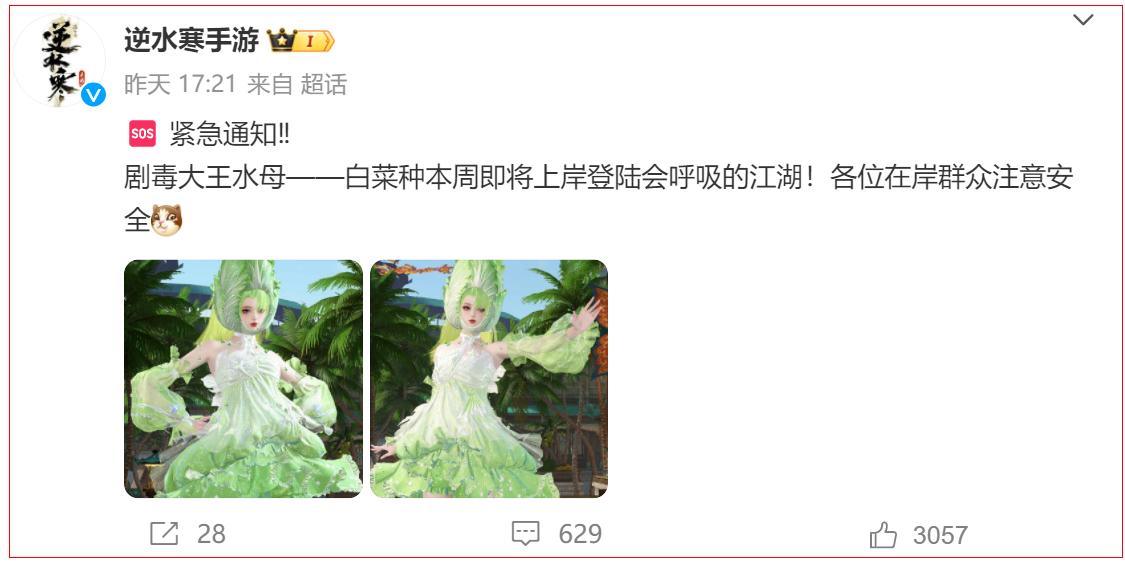 原来是官方在官宣时玩起了花样,安排了一套 “白绿” 相间的染色扮相,还在展示角色头顶戴上了 “白菜” 头套,远远望去,可不就像市场上的大白菜嘛!