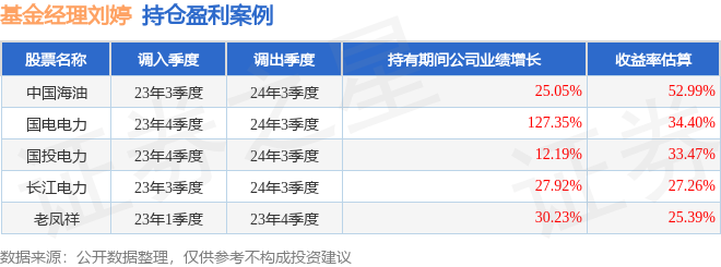 刘婷管理的工银聚丰混合A基金在23年4季度买入国电电力,在持有3个季度后在24年3季度卖出。持有期间的估算收益率为34.4%,持有期间国电电力在2023年到2024年的中报归属净利润增幅达127.35%。