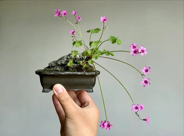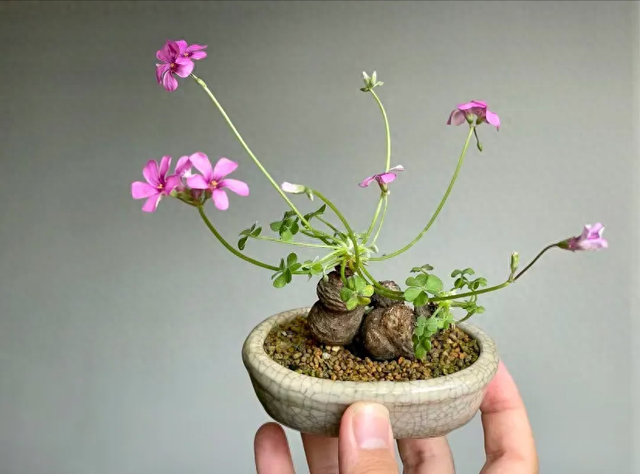 儿时记忆中的酸酸草,如今在花盆中展现出了另一番风貌。它的花朵从根部傲然挺立,高出叶片之上,宛如一群穿着粉色舞裙的小精灵,在微风中翩翩起舞。