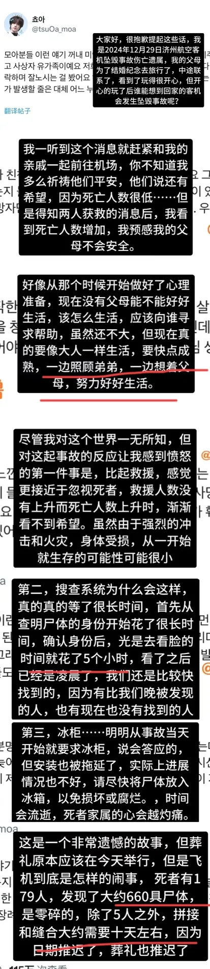 在这次韩国空难中失去双亲的遇难者家属发的“愤怒”帖,字字血泪,讲述空难发生后自己从害怕、心碎、愤怒到无奈的心路历程。 她说父母是为庆祝结婚纪念才去泰国玩儿的,本来玩得很开心,没想到回来的时候遭此横祸。 刚开始被告知“还有希望,遇难人数很低”,但看到只有两人获救后已经预感到父母生还希望不大。 她愤怒的点在于救援不力,遇难人数太多,还有就是确定遇难者身份时间过长,对于遇难者家属来说,每一分每一秒都是煎熬。 现场发现600具人体部分,专业人员通过一系列手段确认身份后,她在“看脸”这个环节就用了5个小时,与别人比还算快的。 空难后续应急处理不利,刚开始说有冰柜,但一直没有提供。 亲人离世,竟然是以此惨烈的方式,任谁也很难接受。遇难者家属除了消化这突如其来的剧痛,还要重新思考未来的生活。