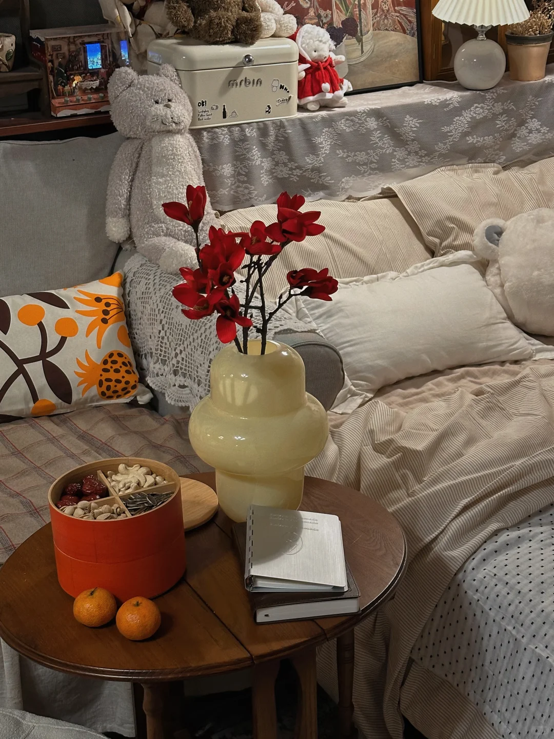 整间屋子是鹅黄色的暖色调搭配大红新春色彩