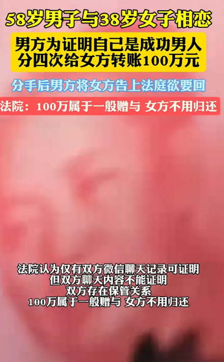 黑龙江双鸭山,58岁大爷给38岁少妇转账100万元,以此来展现雄厚的经济实力,也促成了俩人的感情。岂料,没多久俩人就分手了,大爷立刻起诉女方还钱,说100万是代为保管而已,分手了就应该返还。一审大爷败诉后继续上诉,二审又改口说100万是彩礼。经过多番论证,法院做出判决,大爷后悔莫及。 58岁男子走出法院时,仰天长叹不公平,却也改变不了法院的判决,因为法院已经驳回了男子的再审申请。 男子为什么会一而再再而三的起诉,都是源自于他跟小他20岁前女友的100万转账归属问题。 58岁的男子经人介绍结识了38岁的少妇,模样俏丽可人,虽然将近40岁,但身材却保持的很好,回头率很高。 男子一眼就相中了女子,想要跟她发展发展。但女子并不愿意,嫌弃男子已经58岁的年龄,真要是在一起,岂不是要给男子养老送终? 要是有钱就算了,要是没钱,那女人图什么要跟一个快要退休的大爷在一起,何不找个年龄相仿的呢? 男子不但没有生气,反而为了彰显自己雄厚的经济实力,前后分4次给女子转账100万,希望能够打破两个人之间年龄的界线。 女子收到转账后,还真的抛开了世俗的眼光,答应跟男子在一起。 可好景不长,20岁的年龄差,不管是生活作息上,还是沟通交流上,都暴露出很大的差异,导致两个人没在一起多久就分手了。 既然分开了,男子就向女子索要100万的转账。女子说那钱又不是她要的,是男子自愿给的,哪有吐出来的东西还往回吃的道理。 男子一改往日的彬彬有礼,扬言女子要是不还钱,就去法院告她。女子不在怕的,让男子尽管去告,要是男子赢了,女子马上还钱。 于是男子就去法院起诉,要求女子归还100万,理由是100万是基于购买理财,才暂存在女子手里的,既然分手了,就应该返还。 根据《民法典》第901条的规定:保管人保管货币的,可以返还相同种类、数量的货币;保管其他可替代物的,可以按照约定返还相同种类、品质、数量的物品。 男子声称当初是为了购买理财产品,因女子说自己有渠道,所以才把钱暂存在女子这里的。因当时二人是情侣关系,所以毕竟放心,并未索要。 但如今两个人已经分手,没有了任何身份,女子就应该归还男子暂存在女子这用于购买理财的100万元。 可女子却不是这么说的,女子并不承认答应过要帮男子保管100万元。而这100万元是男子为了求得女子的芳心自愿赠与的,凭什么要还回去,又不是女子逼迫索要的。 根据《民法典》第658条的规定:赠与人在赠与财产的权利转移之前可以撤销赠与。 经过公证的赠与合同或者依法不得撤销的具有救灾、扶贫、助残等公益、道德义务性质的赠与合同,不适用前款规定。 男子将100万元转账给女子那刻起,财产的权利已经发生了转移,那100万元属于女子所有,归女子支配,男子以无权利撤销赠与行为。 法院根据双方提交的证明材料,综合论证后,判决男子败诉,女子不用返还100万元。 但是男子并不甘心,提起上诉,这次男子又说100万元是基于结婚为目的给付的彩礼,因现如今未达成结婚的目的,要求撤销赠与。 根据《民法典》第158条的规定:民事法律行为可以附条件,但是根据其性质不得附条件的除外。附生效条件的民事法律行为,自条件成就时生效。附解除条件的民事法律行为,自条件成就时失效。 既然男子跟女子并不能步入婚姻的殿堂,那么当初给付的100万元彩礼钱,男子认为女子应如数返还回来。 可当法庭要求男子提供证据证明100万元是支付彩礼的行为时,男子却拿不出任何证据证明。 根据《最高法关于民事诉讼证据若干问题的规定》第2条的规定:当事人对自己提出的诉讼请求所依据的事实或者反驳对方诉讼请求所依据的事实有责任提供证据加以证明。 没有证据或者证据不足以证明当事人的事实主张的,由负有举证责任的当事人承担不利后果。 由于男子不能提供出证据证明自己的主张,应当承担举证不利的后果。 因此法院做出判决,根据聊天记录无法证明双方存在保管关系,100万应为一般赠与,女子不用归还。 而后男子提出再审申请,法院驳回申请。 一次勇敢换来一辈子的内向,经历过大风大浪的男子,竟没想到自己会在58岁栽了跟头,这到底是谁的错呢? 对此,你怎么看?欢迎留言评论。