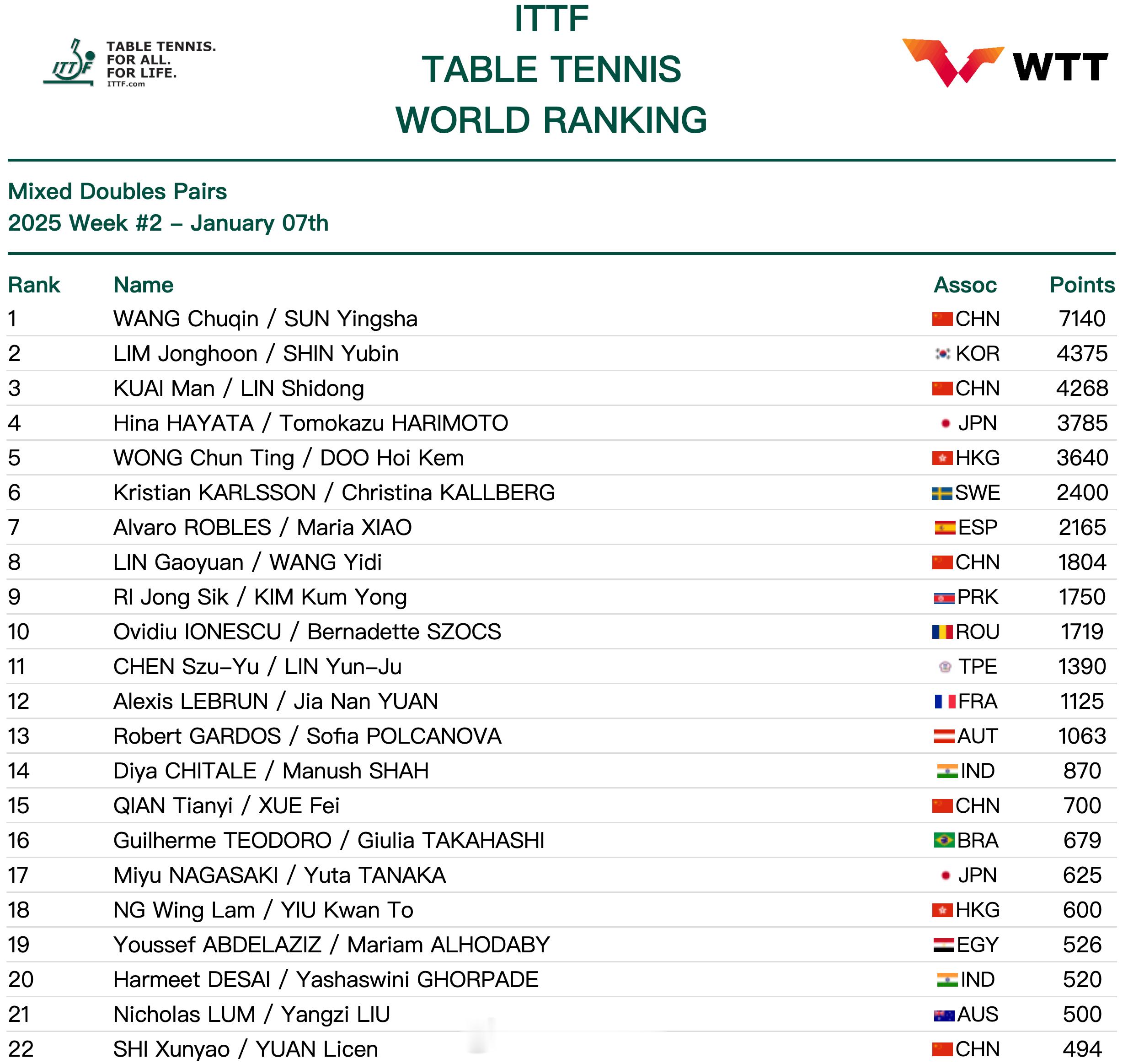 王楚钦/孙颖莎稳居混双第1,林钟勋/申裕斌紧随其后,蒯曼/林诗栋排在第3,早田希娜/张本智和、黄镇廷/杜凯琹分列4、5位。林高远/王艺迪排名第8。