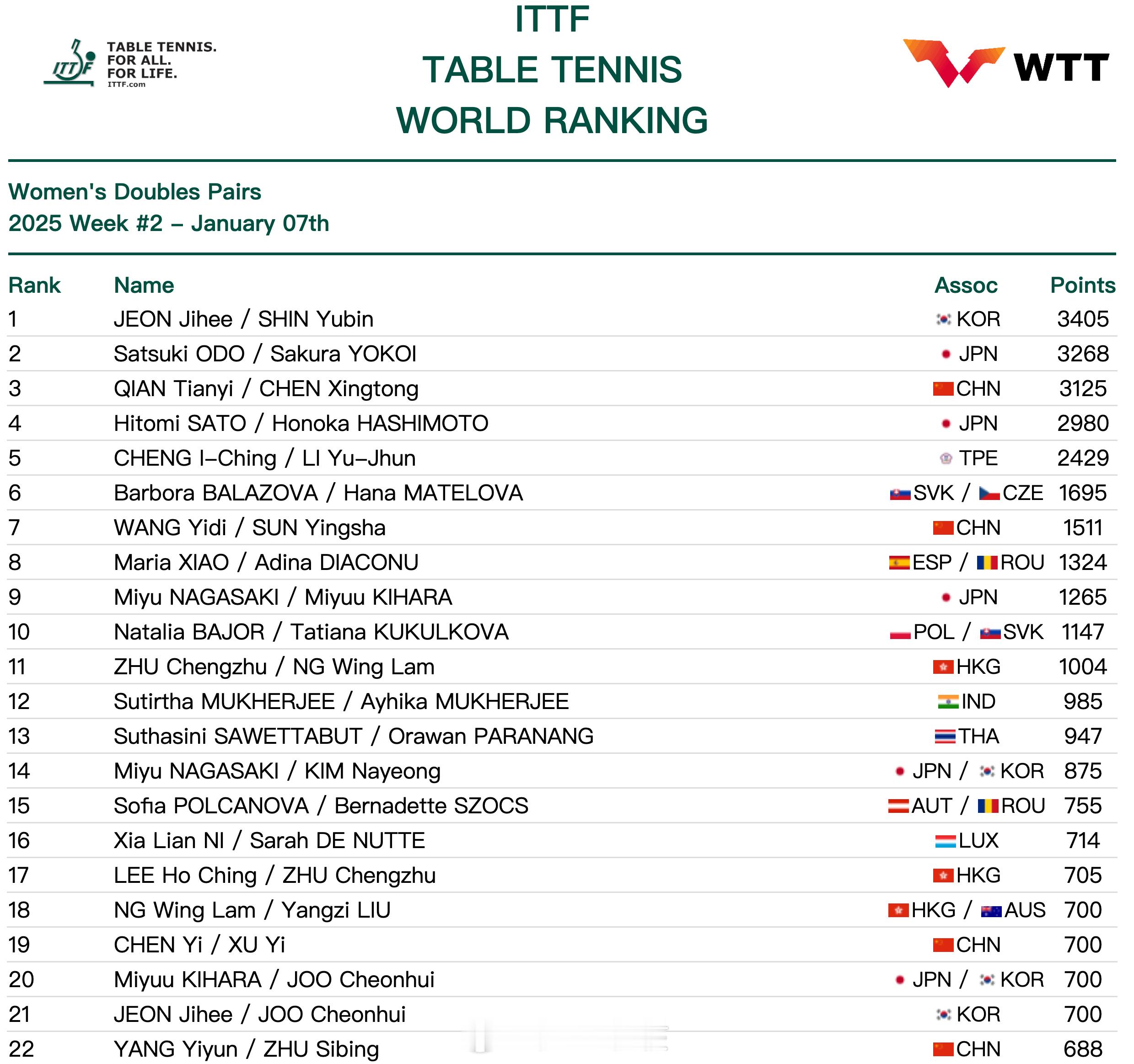 女双韩国的田志希/申裕斌排在首位,大藤沙月/横井咲樱紧随其后,钱天一/陈幸同排名第3,王艺迪/孙颖莎排在第7位。