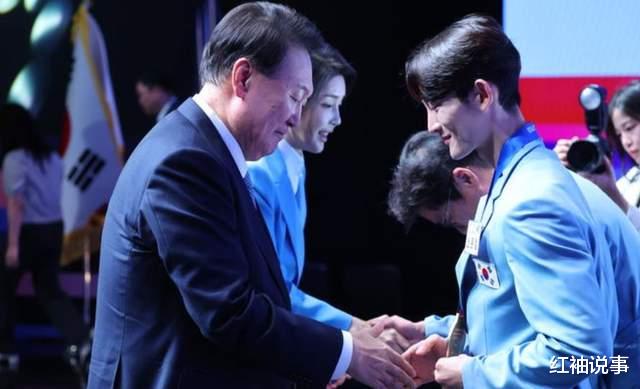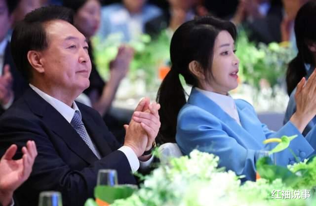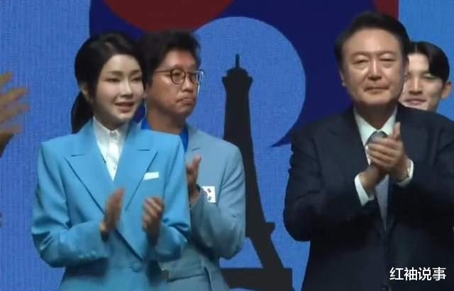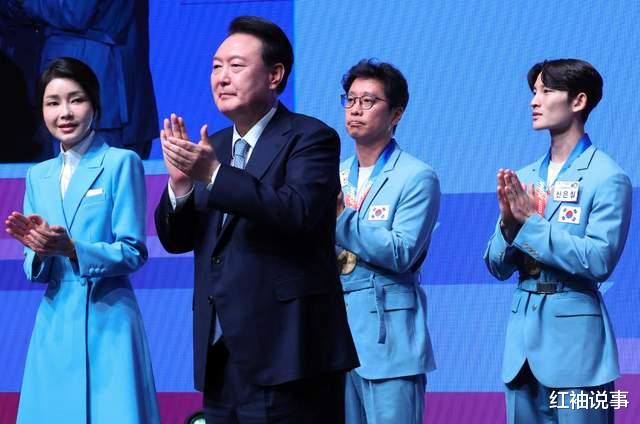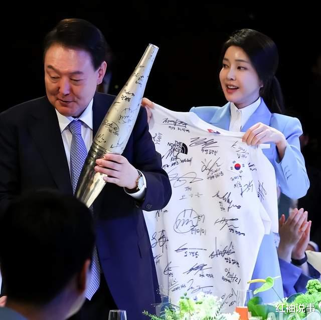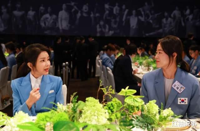 在庆功宴上,金建希亲自给奥运健儿们佩戴奖牌,尹锡悦总统也发表了重要讲话。不得不佩服金建希的皮肤状态很好,脸上没有一点皱纹,身材纤细没有一丝赘肉。
