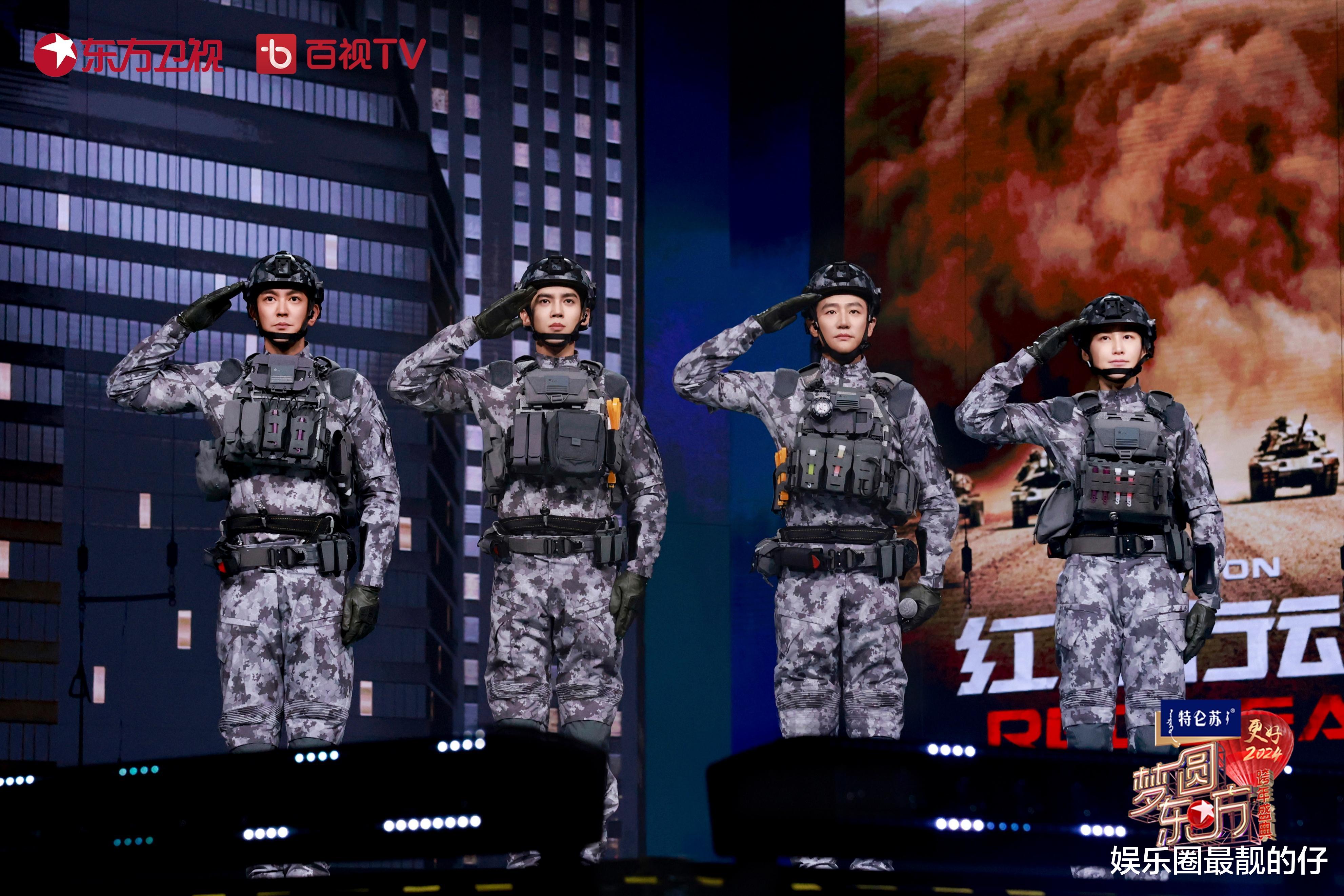 最后,盛典还向大家传递了伟大的家国情怀。“红海系列”电影剧组新“蛟龙队”成员黄轩、于适、杜江、蒋璐霞身穿迷彩服以高空速降的方式来到舞台上,“当乘风破浪,靖万里海疆,肩扛展示中国军队的荣誉,我准备好了”“无论你在世界何处遇到危险,我都会带你回家,我准备好了。”在一声声霸气宣言中彰显中国军人的英雄本色,并现场展示“花式”俯卧撑诠释中国军人的热血力量,致敬时代英雄,也展现出中国文艺工作者的创新精神和热血情怀。