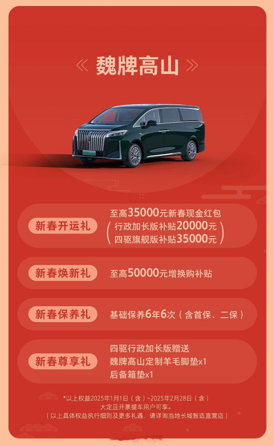 都这么卷了吗?连魏牌高山MPV都有购买活动了,看政策除了能立享100%地补兜底置换补贴至高 35000 元现金红包之外,还有50000 元增换购补贴等多重新春好 礼,出行头等舱太有面了,冰箱彩电大沙发的配置谁能不爱……