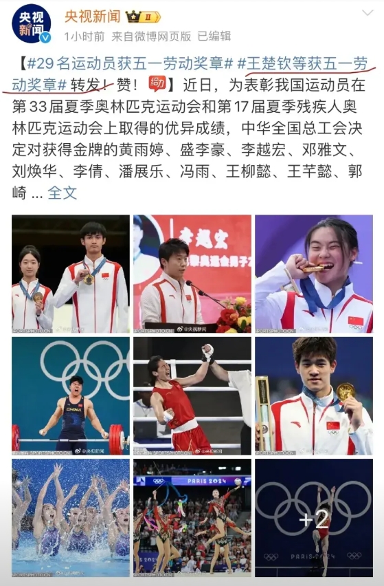 今天一早公布了全国五一劳动奖章和中国青年五四奖章的获奖名单。 其中王楚钦获得五一劳动奖章,孙颖莎获得五四奖章。 央妈对这一荣誉进行了转发,里面有很多运动员,央妈转发的时候带的词条只有孙颖莎和王楚钦。 带着浓浓的宠爱和偏爱,但这一切都是值得的。 付出了,大家都会记得。 我们的劳模和青年楷模,2024年很好,2025年更好。 莎莎楚钦一起加油。