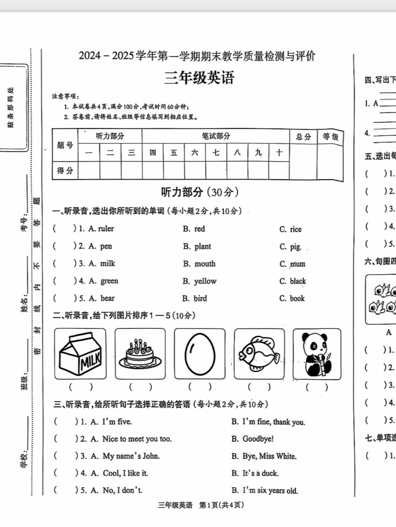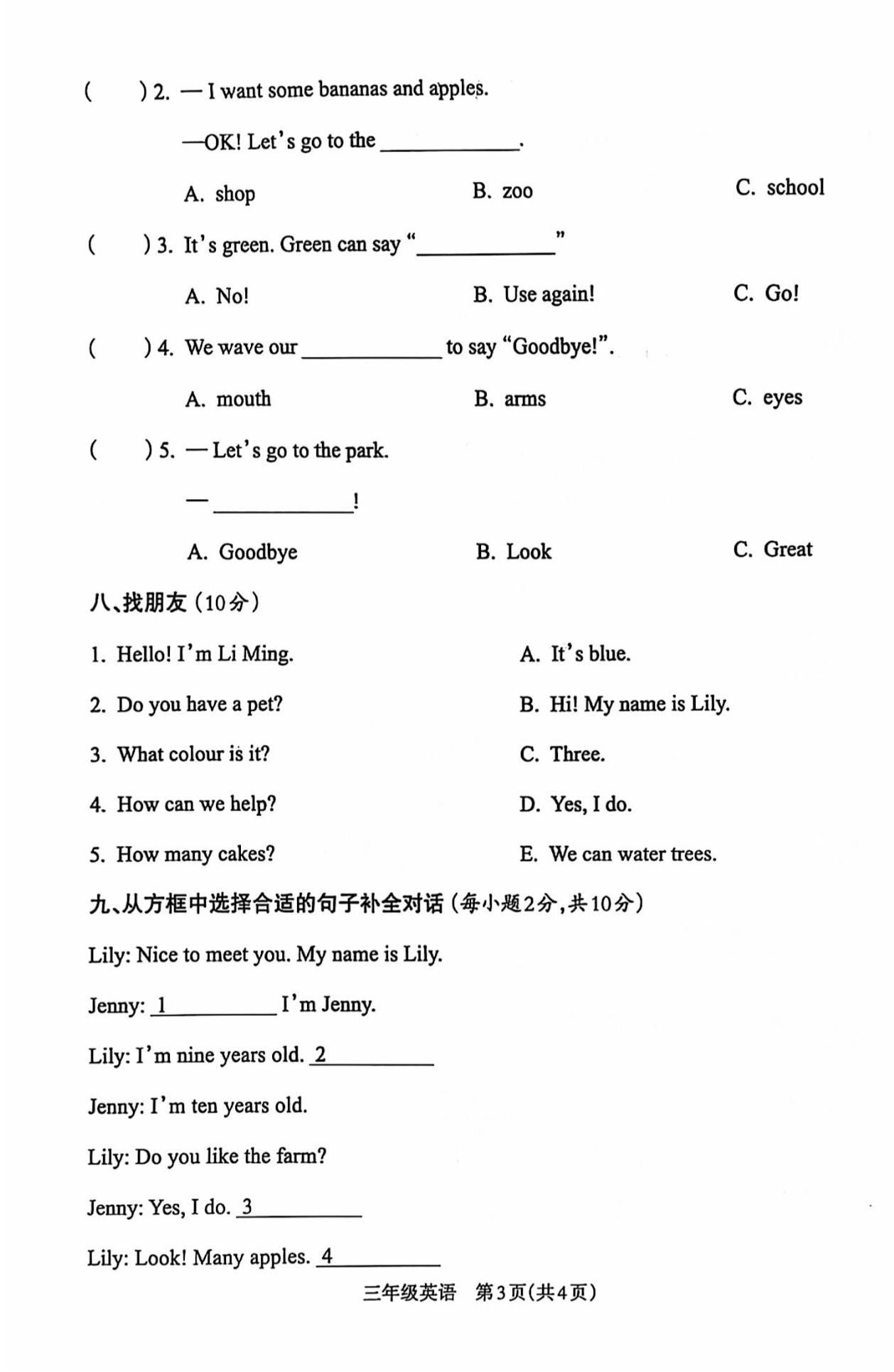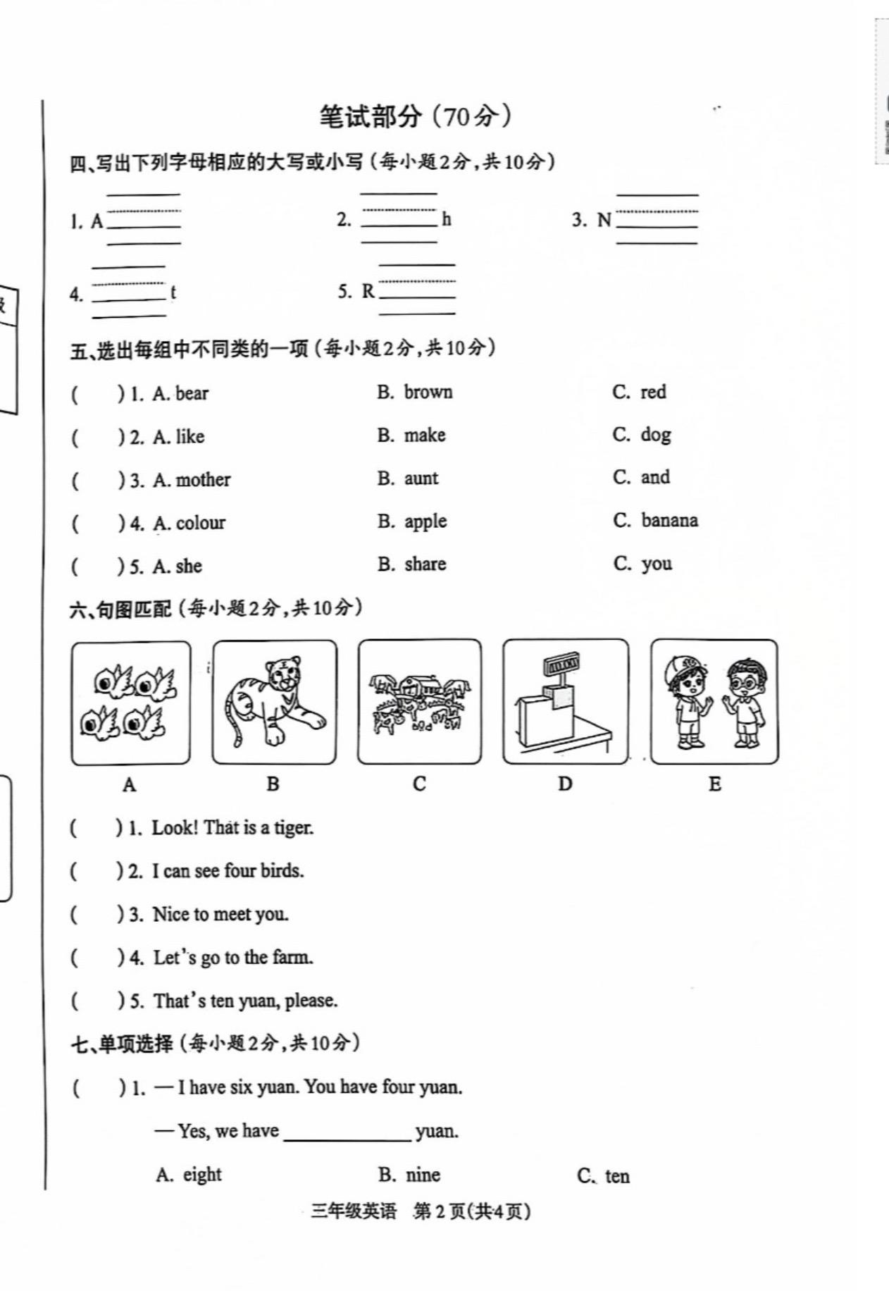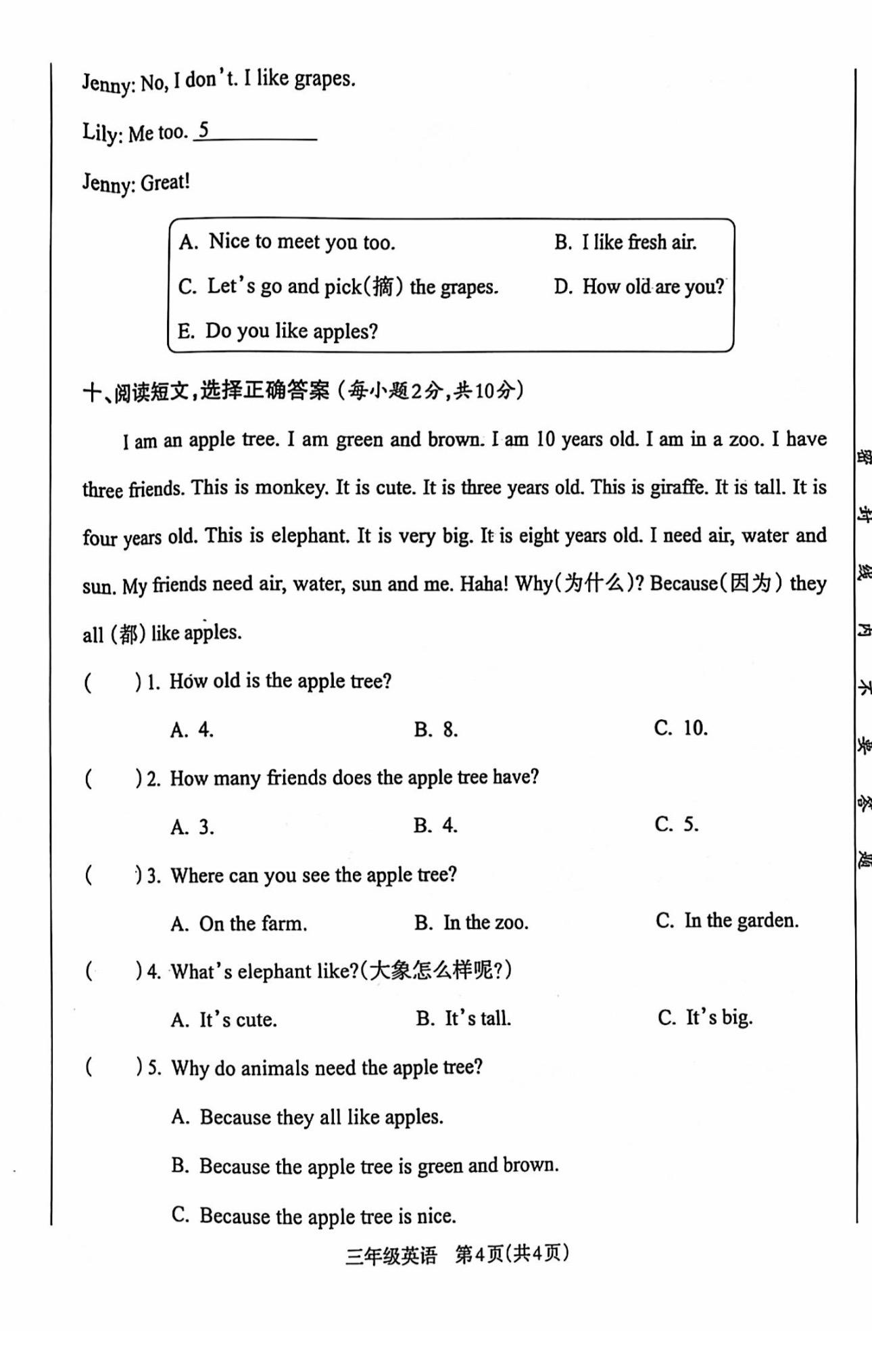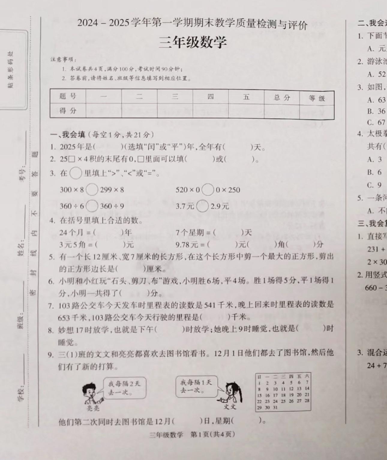 三年级期末考试真题(山西吕梁地区)妞妞已考完,这是孩子的考试题,总体不...