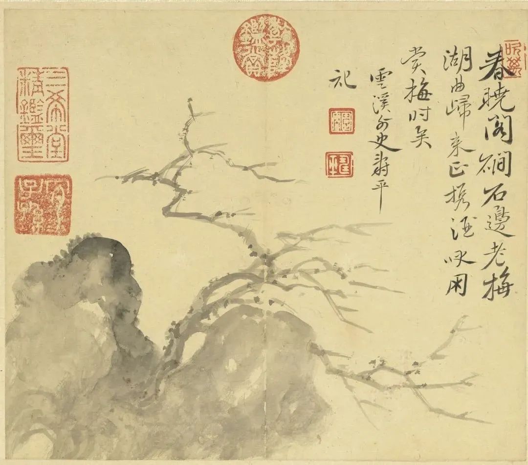 据画作上的题跋可知,《湖山小景册》中的一些画作是恽寿平在特定情境下创作的。例如,其中一幅画作题有“岁在丙寅(西元一六八六年)春。与端木诸子。同步阳山旧圃。看古藤蜿蜒如龙蛇。苔藓斑驳。盖数百年物也。戏为图记之。”这说明该画作是恽寿平在丙寅年春天,与友人一同游览阳山旧圃时,被那里的古藤、苔藓等自然景物所吸引,从而创作而成的。