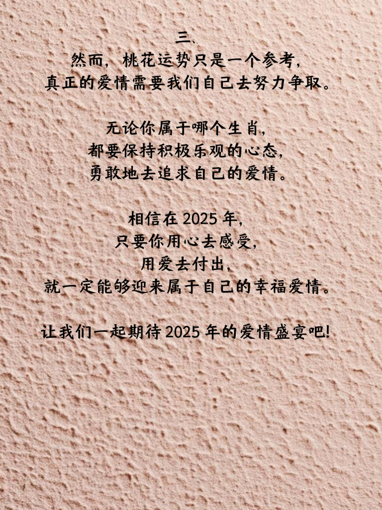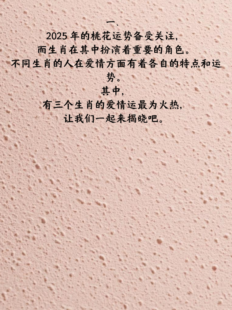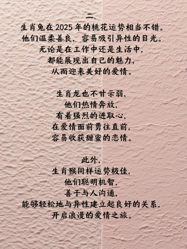 一、2025 年的桃花运势备受关注,而生肖在其中扮演着重要的角色。不同生肖的人在爱情方面有着各自的特点和运势。其中,有三个生肖的爱情运最为火热,让我们一起来揭晓吧。 二、生肖兔在 2025 年的桃花运势相当不错。他们温柔善良,容易吸引异性的目光。无论是在工作中还是生活中,都能展现出自己的魅力,从而迎来美好的爱情。生肖龙也不甘示弱,他们热情奔放,有着强烈的进取心,在爱情面前勇往直前,容易收获甜蜜的恋情。此外,生肖猴同样运势极佳,他们聪明机智,善于与人沟通,能够轻松地与异性建立起良好的关系,开启浪漫的爱情之旅。 三、然而,桃花运势只是一个参考,真正的爱情需要我们自己去努力争取。无论你属于哪个生肖,都要保持积极乐观的心态,勇敢地去追求自己的爱情。相信在 2025 年,只要你用心去感受,用爱去付出,就一定能够迎来属于自己的幸福爱情。让我们一起期待 2025 年的爱情盛宴吧!