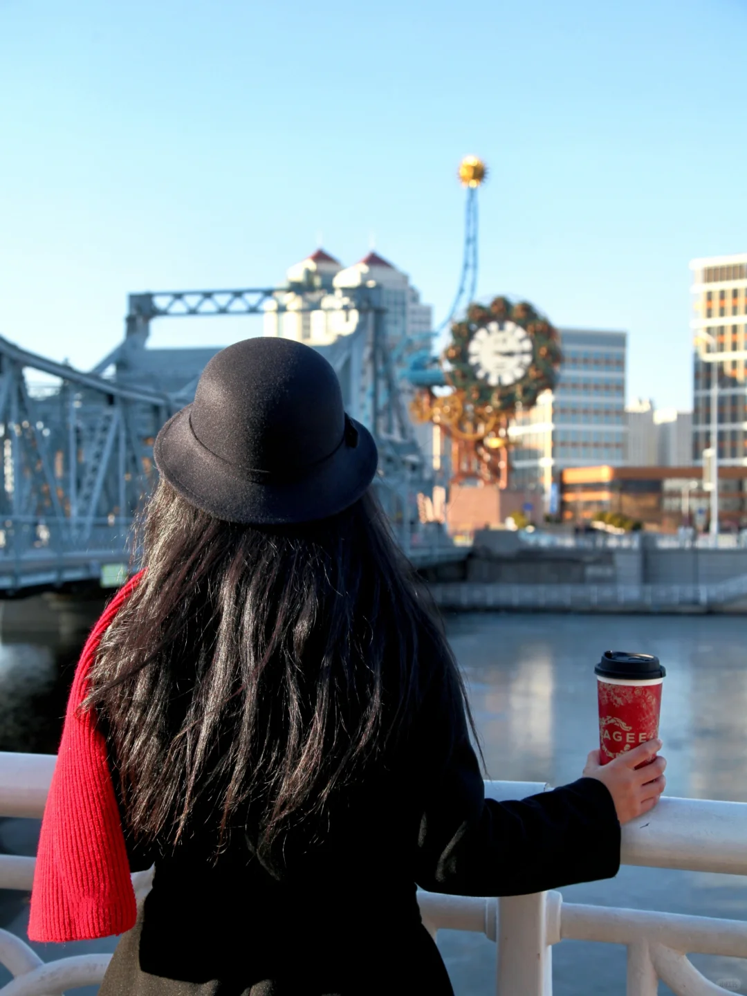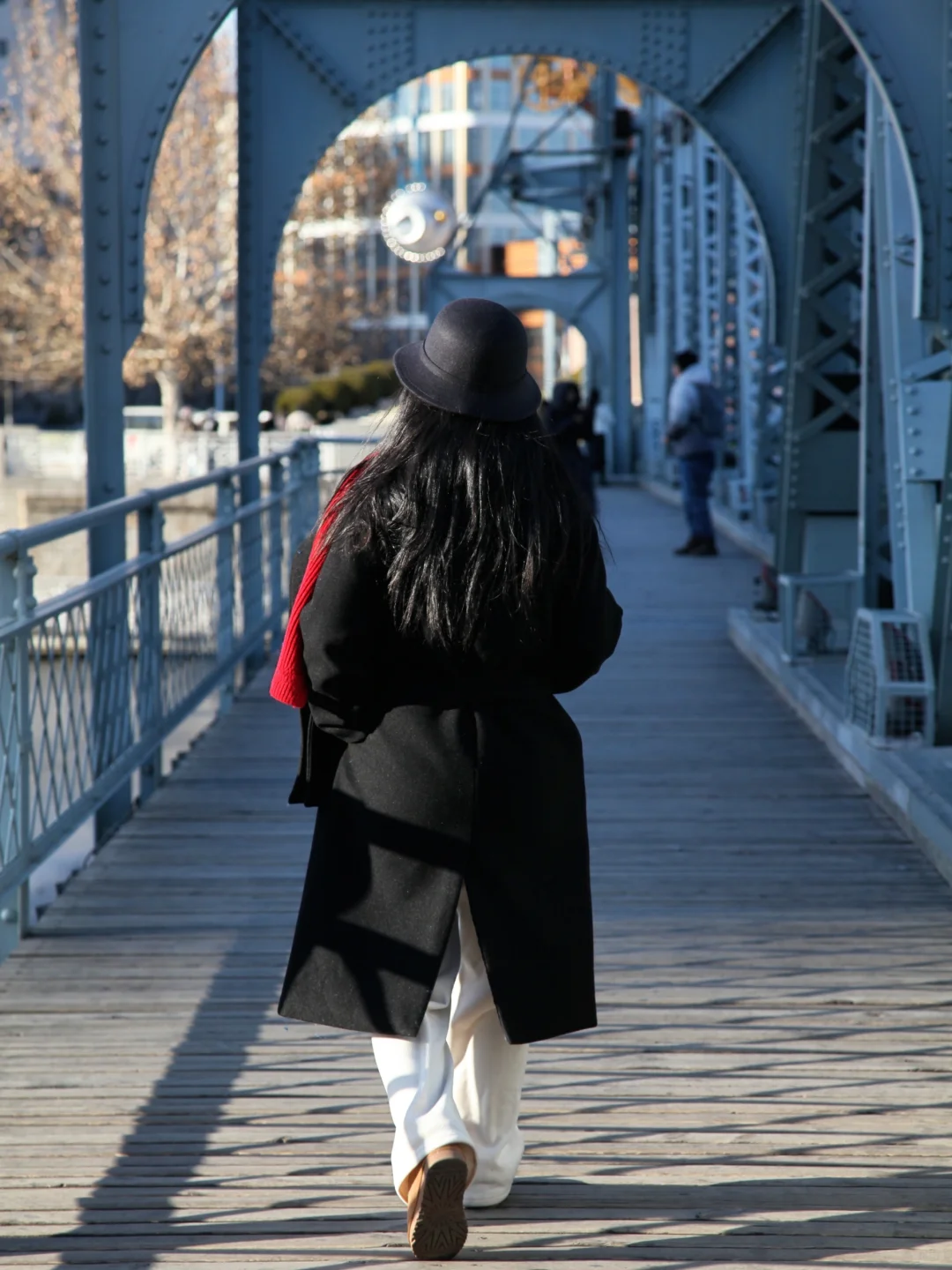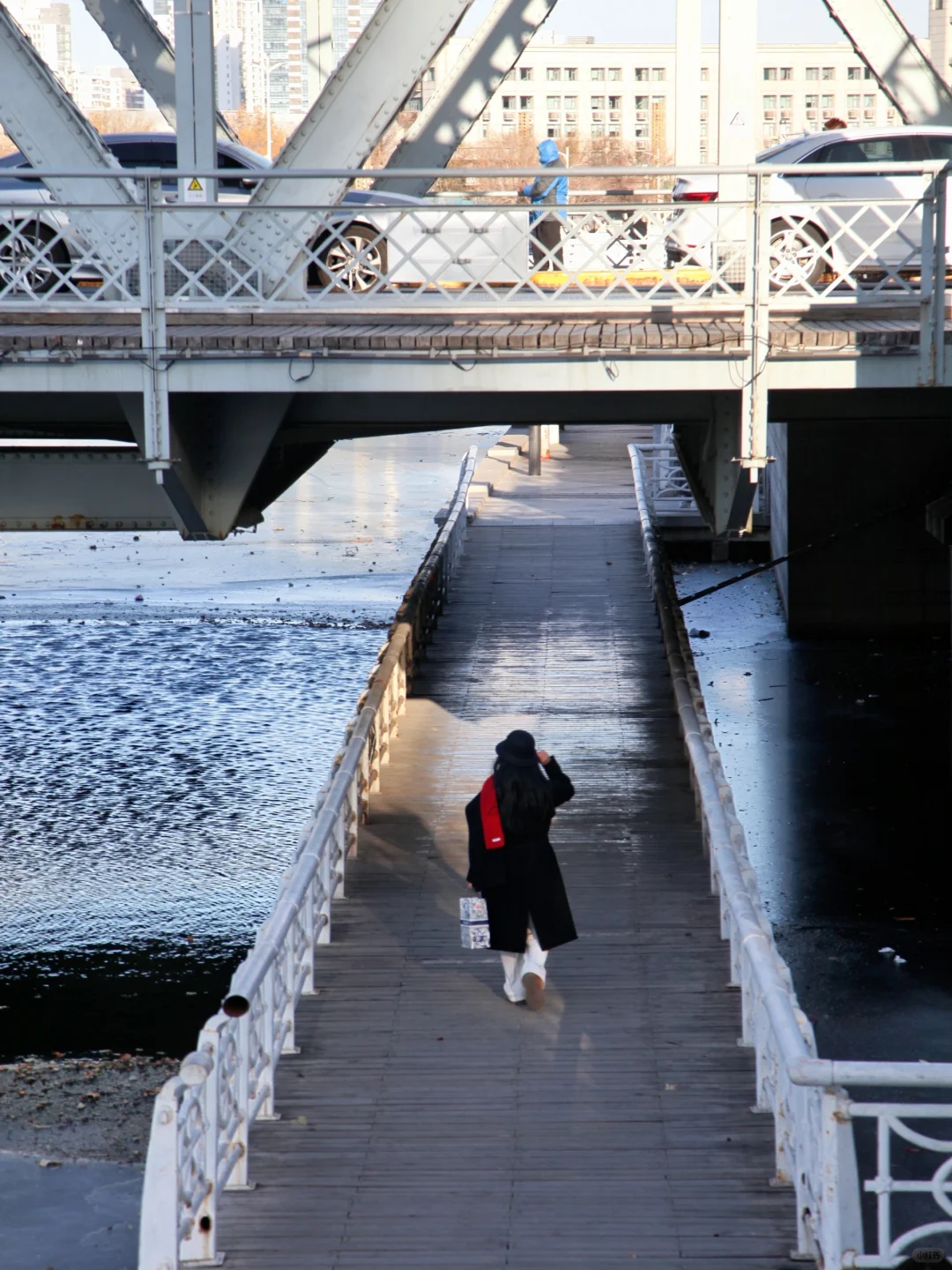 在桥下走路,摄影师在桥上俯拍,有电影感