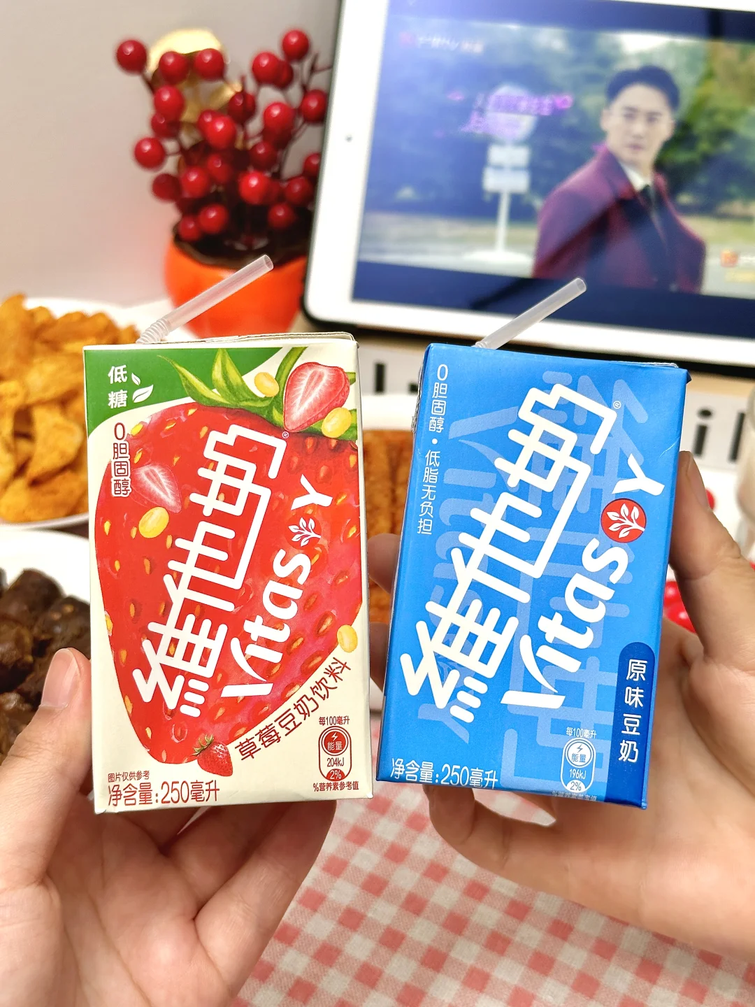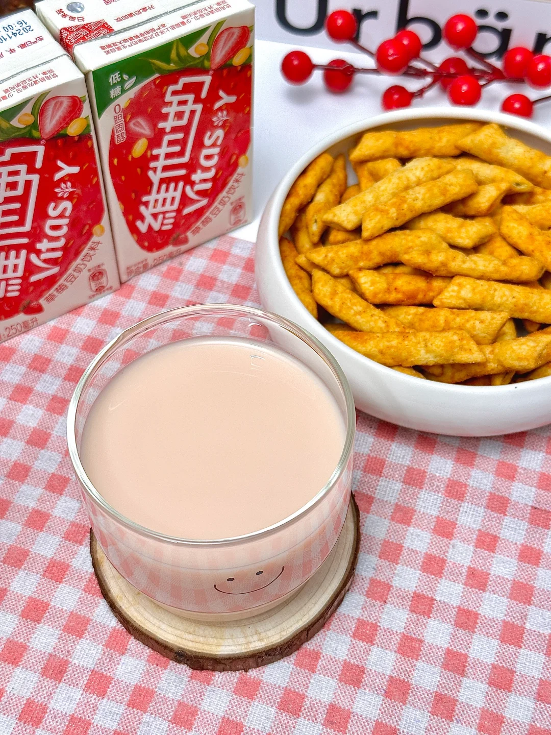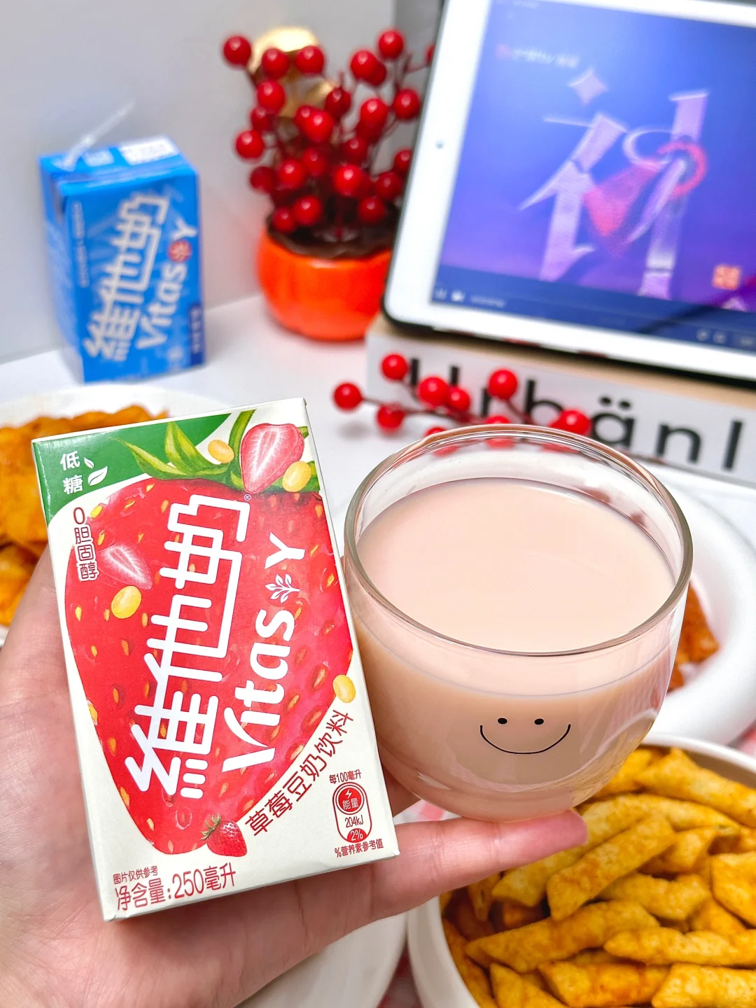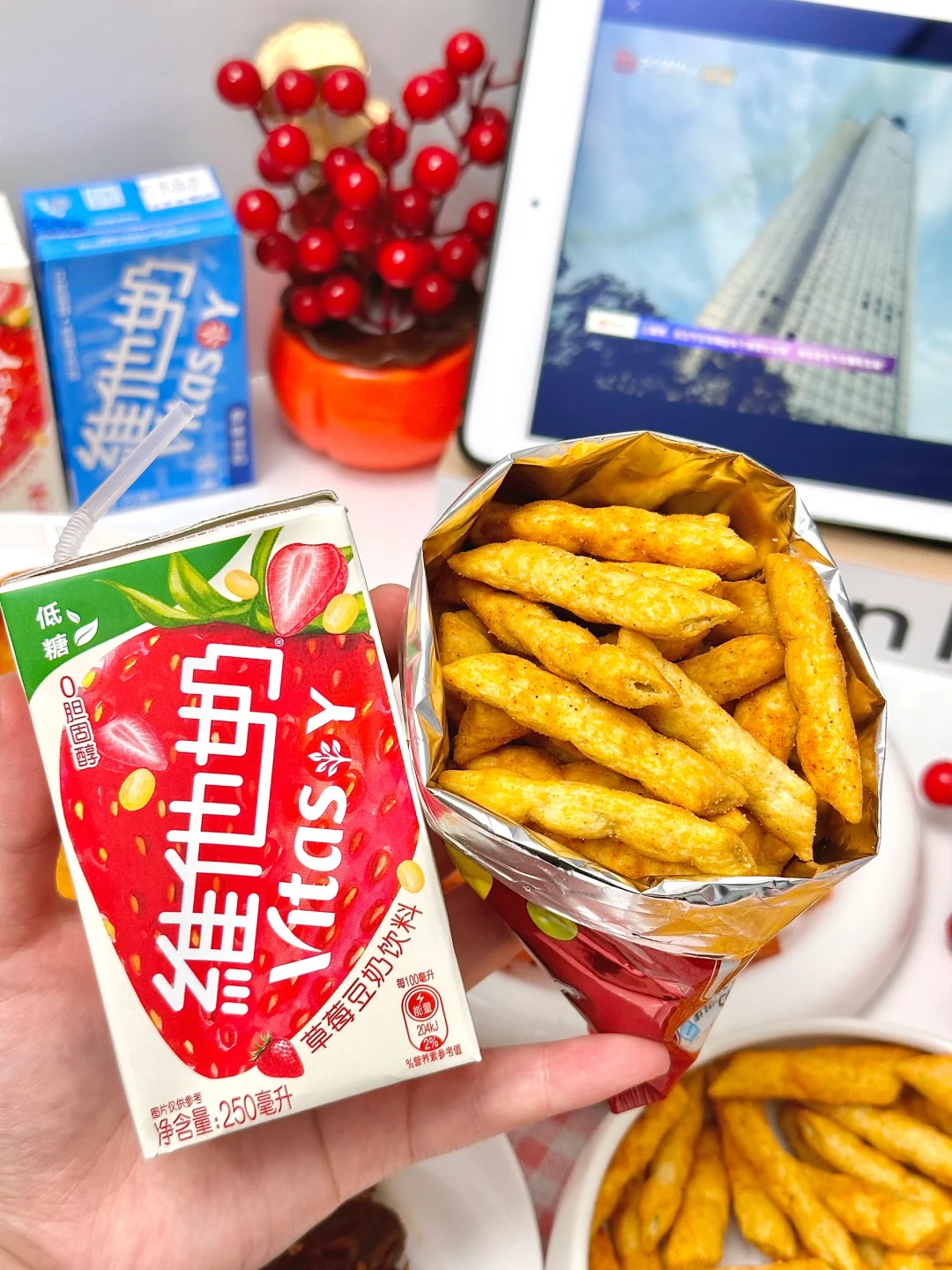 鸭脖、豌豆酥吃完后劲好辣,这时来上一口草莓豆奶解辣又清爽!
