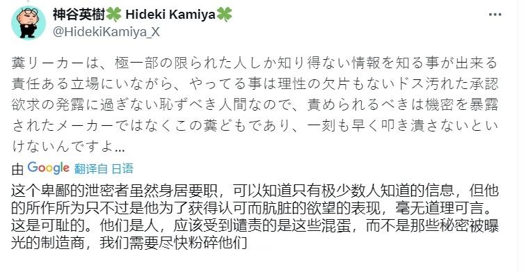 【 神谷英树怒斥泄露者 气到破口大骂:祝一辈子踩屎】因Switch2的提前泄露,知名游戏制作人神谷英树极为愤怒,近日在X连发数条文字,对提前泄露Switch 2的泄密者进行了猛烈抨击。