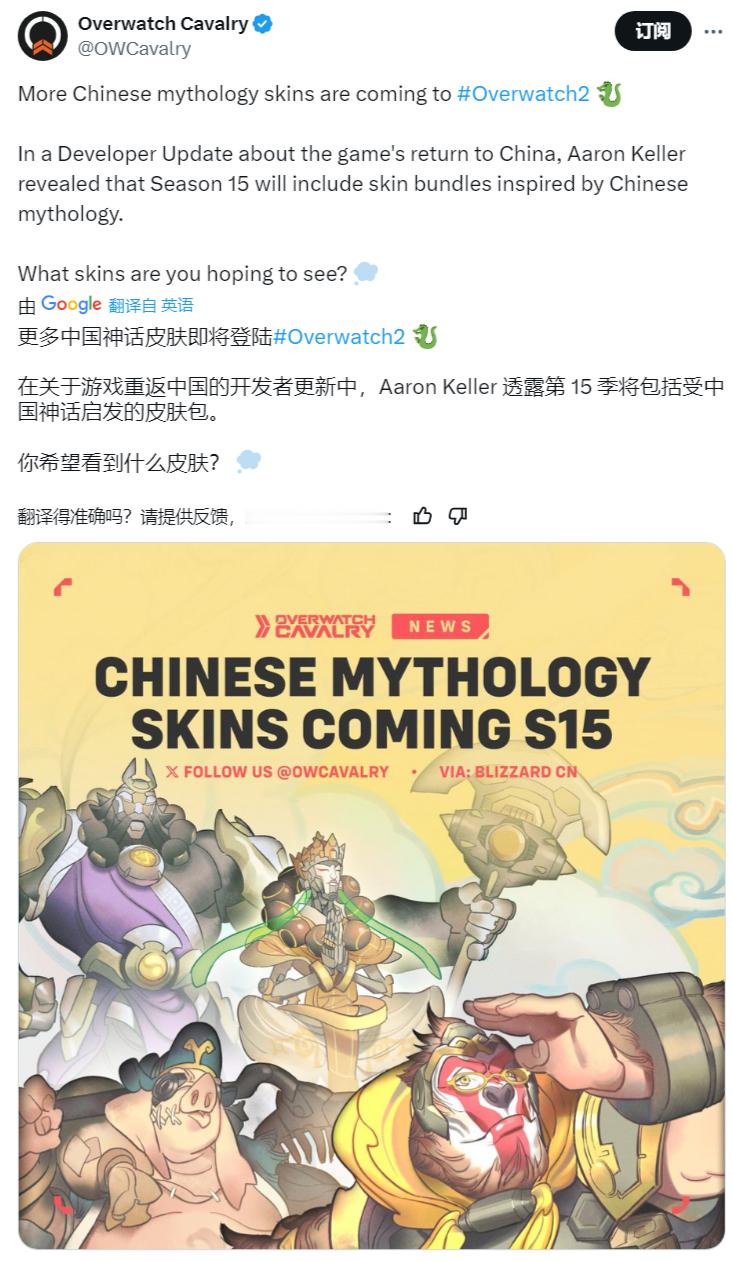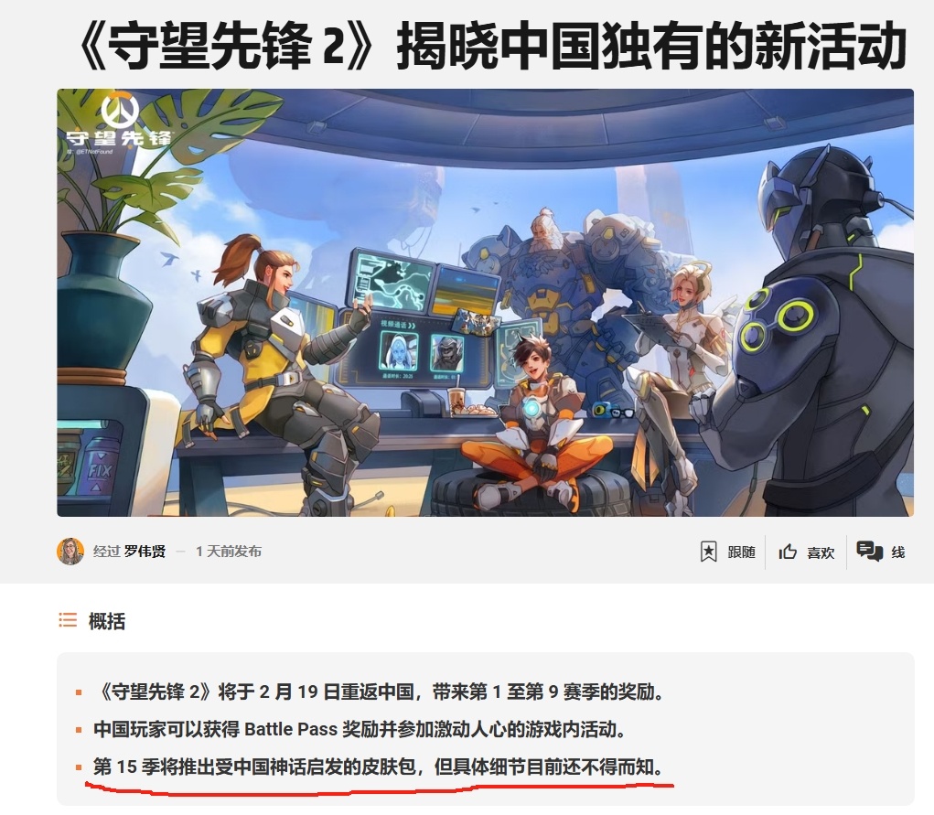 守望先锋2第15赛季将上架以「中国神话」为主题的皮肤包