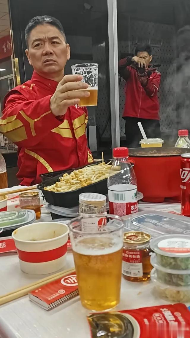 饭桌上的火锅热气腾腾,各种食材在桌子上铺满,刘强东一旁有喝了半杯的啤酒,可见他跟外卖小哥是共饮畅聊。