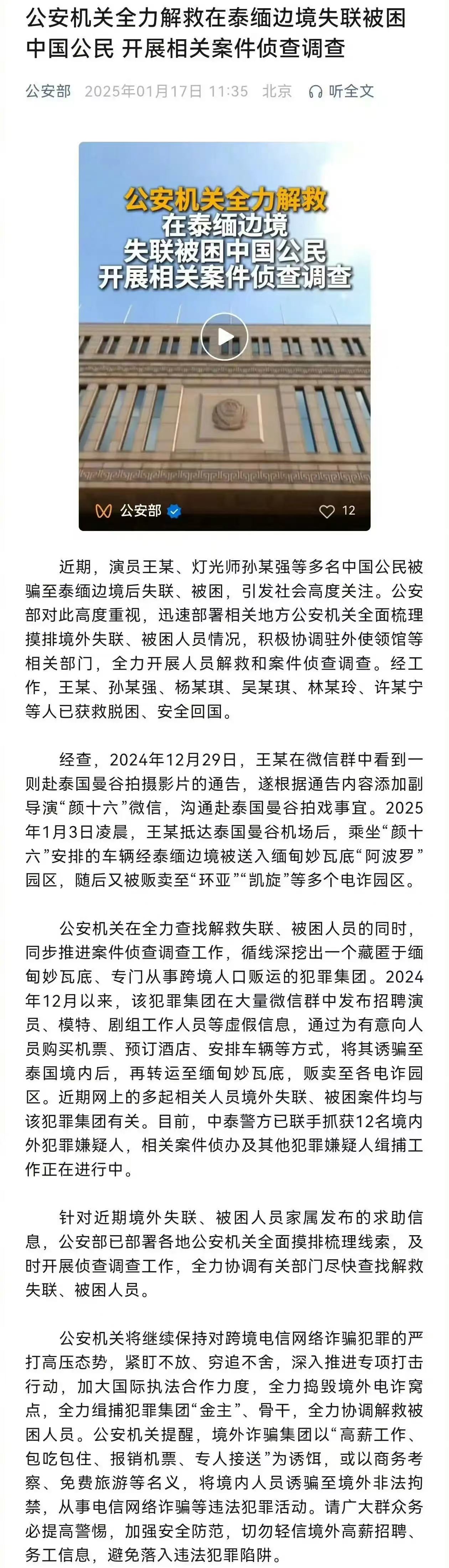 中泰警方已联手抓获12名境内外犯罪嫌疑人,多人已获救脱困、安全回国。公安部表示,警方将继续严打跨境电信网络诈骗犯罪,捣毁境外电诈窝点,缉捕犯罪集团“金主”、骨干,协调解救被困人员。