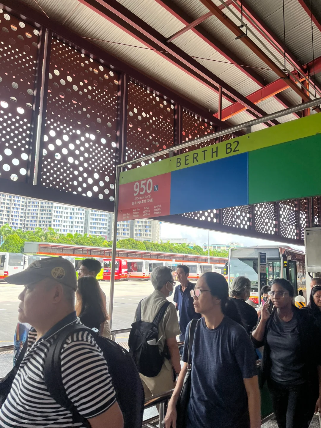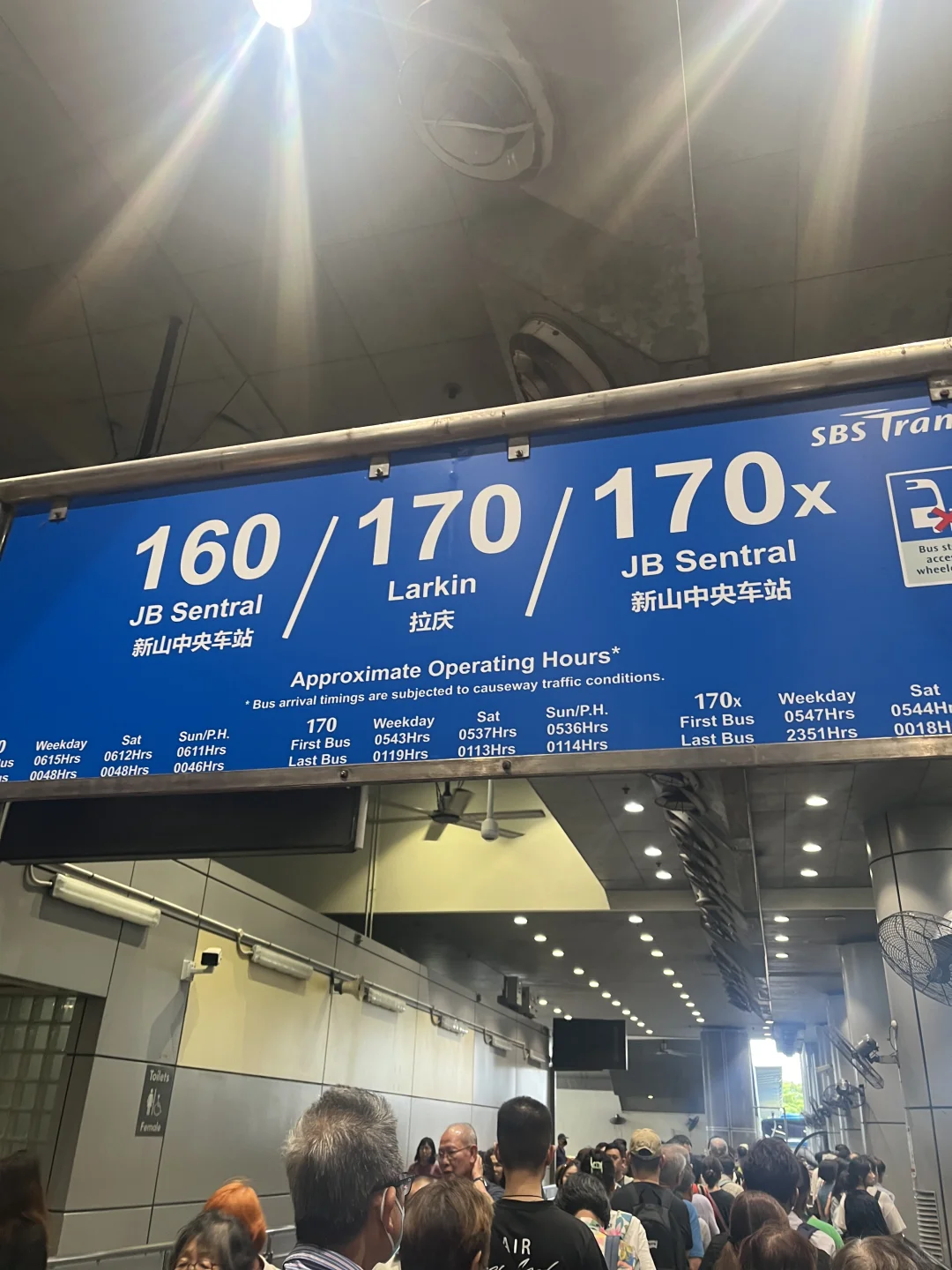 上车大概20分钟会到Woodlands关口,跟随人流出关。任何一个窗口自助刷护照就可以,出关后下电梯,左转乘坐160/170/170X/950任一公交车🚌,大概10分钟就可以到达新山关口。新山关口也是刷护照入关,方便快捷~