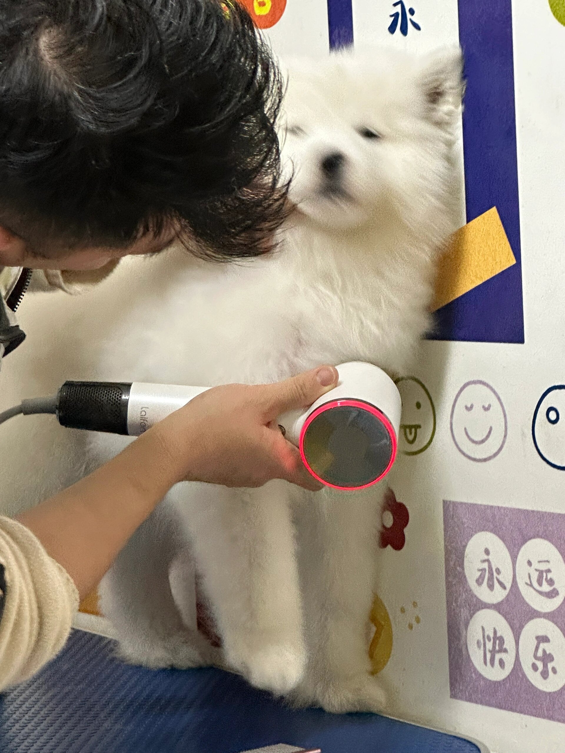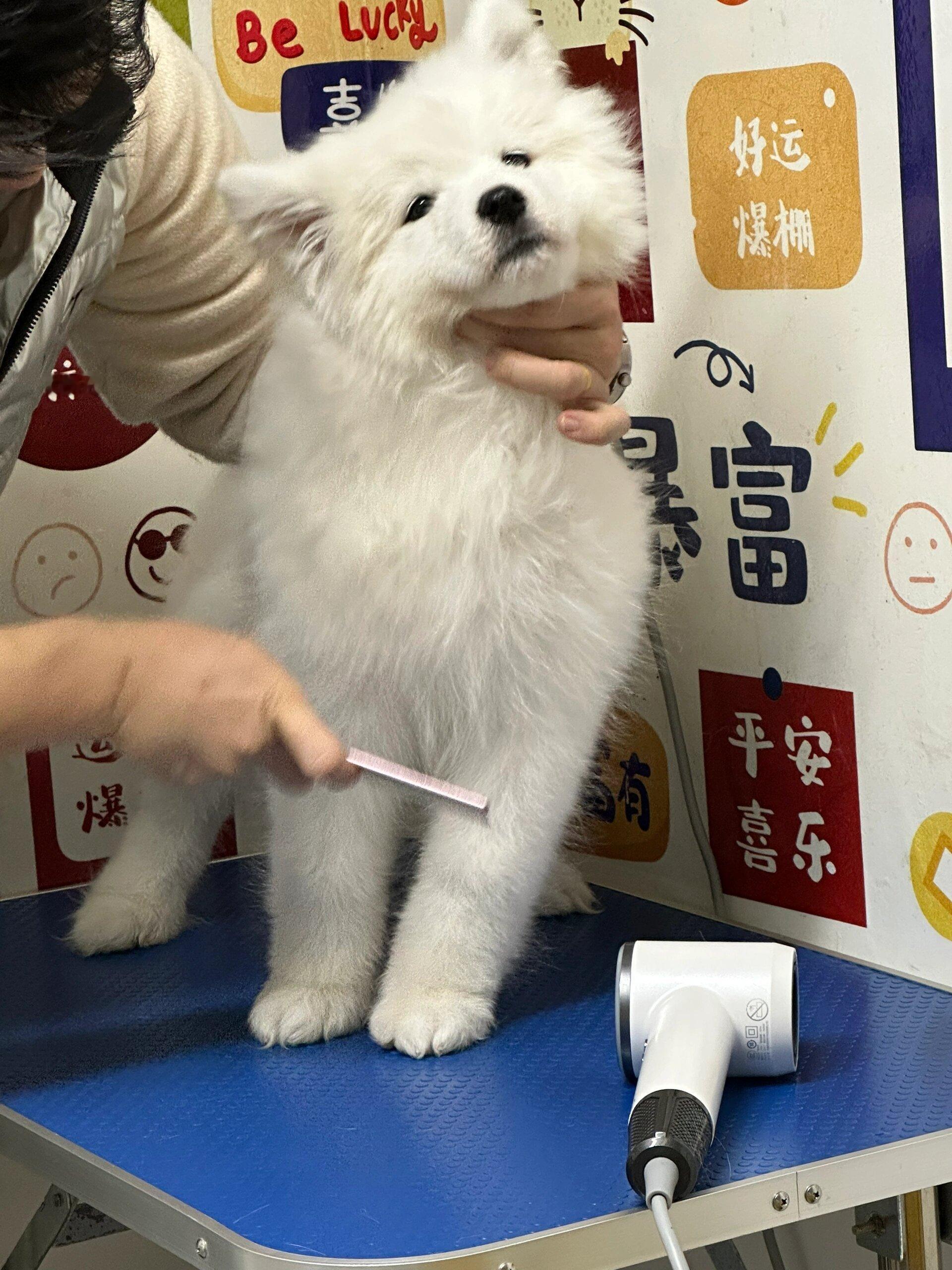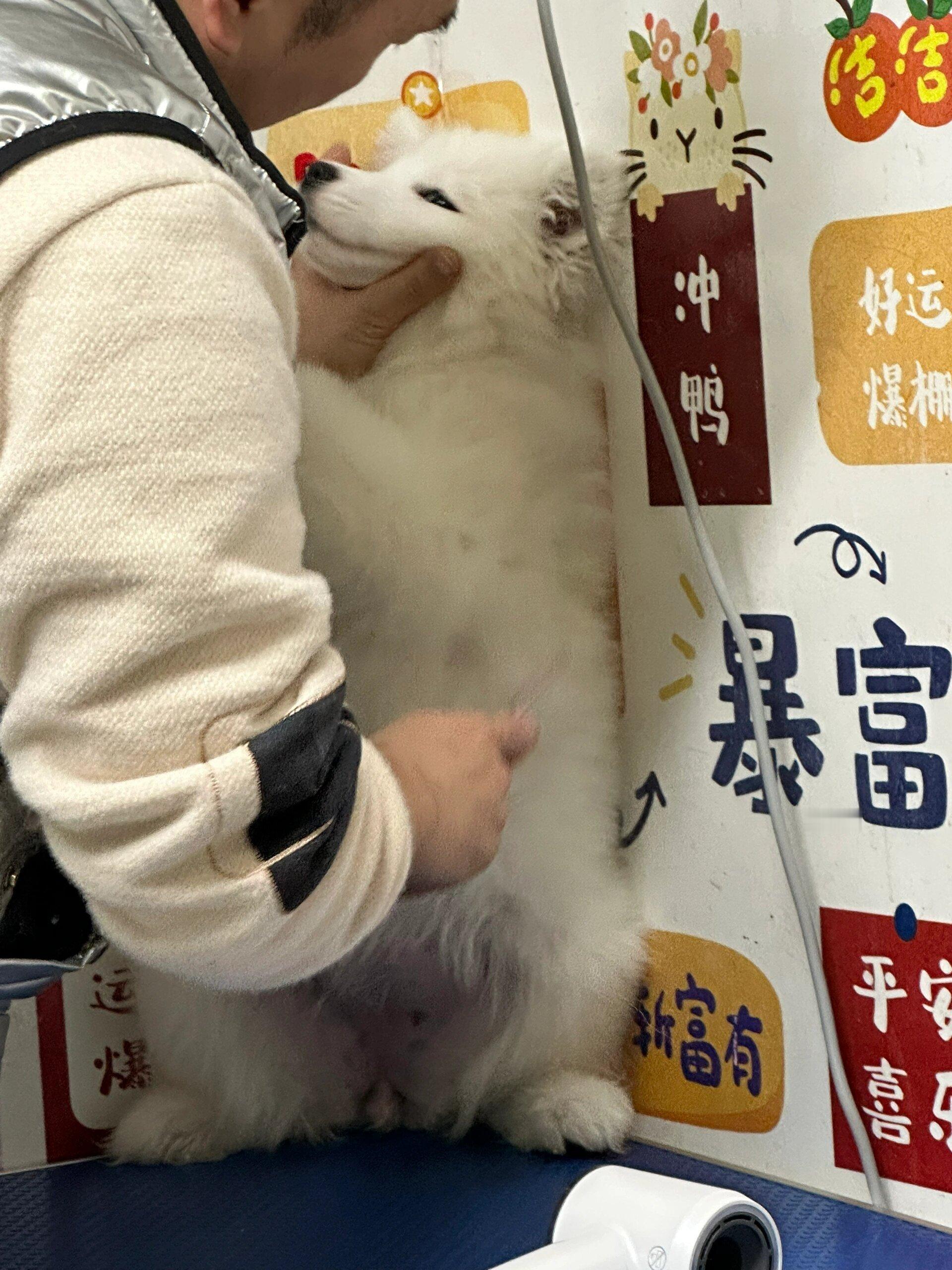 正在等待奶奶手滑掉肉肉的萨摩耶
