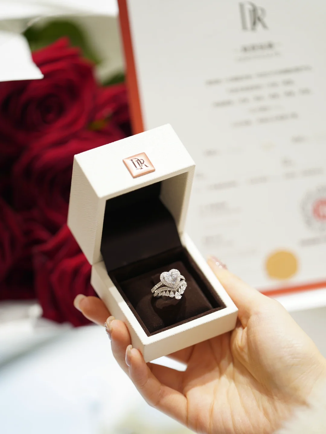 在一大一小的坚持下,试了几款钻戒,而我还是喜欢原来买的那款DR HERAT的心形钻,一圈心形小钻包裹着中间的爱心主钻,有种真心被稳稳呵护的感觉,戴着也很舒服~老公似乎看出了我的心思,他笑着对店员说:“看来还是这款她最喜欢。” 店员也笑着说:“经典款总是有着独特的魅力,它见证了你们的爱情,升级后的它,一定会承载着更多的幸福。” 在豌豆的坚持下还叠戴了DR的周年戒,显得心形钻更闪更饱满了~皇冠的造型很吸睛,九颗水滴钻和心形钻戒搭一起,仿佛能长长久久守护我们的婚姻和爱情~还听过一种说法,水主财,希望这九颗像水滴一样的钻石能给我带来财运和好运,让我们的1+1>2的生活更加美满~