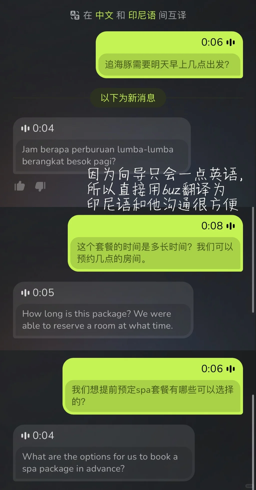 像我经常在旅途中尤其是东南亚地区,经常会遇到说不同语言或者英语口音很重的朋友,用它就能轻松解决交流问题。我们的向导只会一点英语,所以直接用buz翻译成印尼语和他沟通就很方便。旅途中我遇到不同国家的朋友,用它也能轻松聊天没有压力。