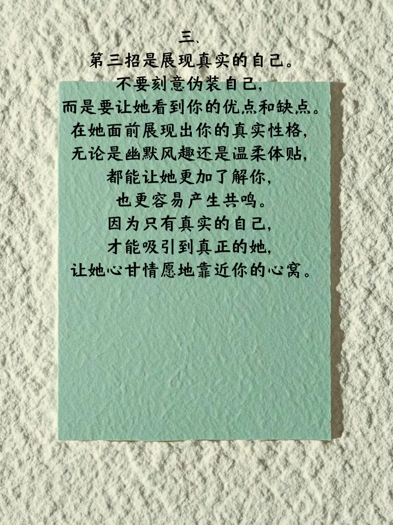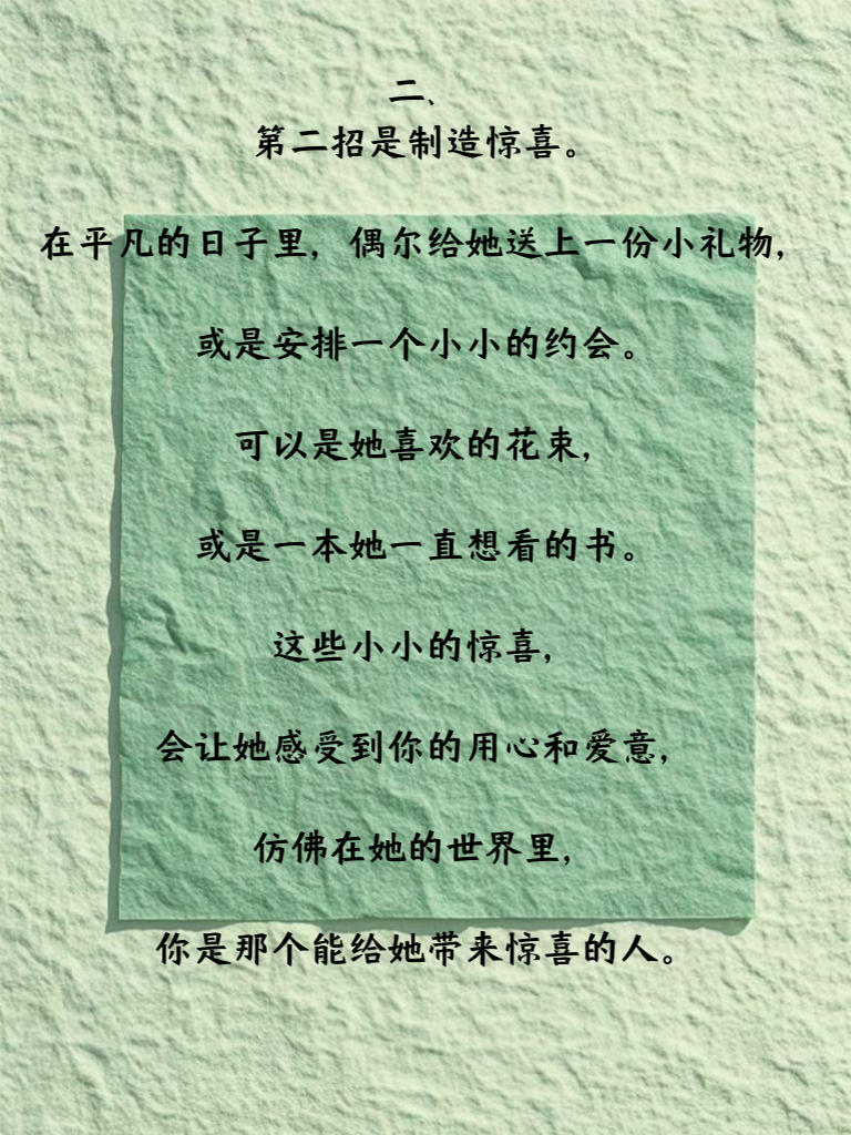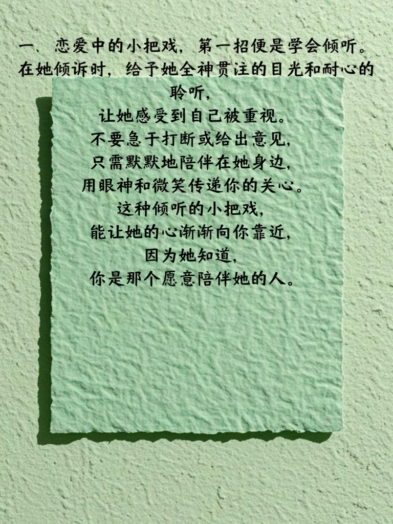 一、恋爱中的小把戏,第一招便是学会倾听。在她倾诉时,给予她全神贯注的目光和耐心的聆听,让她感受到自己被重视。不要急于打断或给出意见,只需默默地陪伴在她身边,用眼神和微笑传递你的关心。这种倾听的小把戏,能让她的心渐渐向你靠近,因为她知道,你是那个愿意陪伴她的人。 二、第二招是制造惊喜。在平凡的日子里,偶尔给她送上一份小礼物,或是安排一个小小的约会。可以是她喜欢的花束,或是一本她一直想看的书。这些小小的惊喜,会让她感受到你的用心和爱意,仿佛在她的世界里,你是那个能给她带来惊喜的人。 三、第三招是展现真实的自己。不要刻意伪装自己,而是要让她看到你的优点和缺点。在她面前展现出你的真实性格,无论是幽默风趣还是温柔体贴,都能让她更加了解你,也更容易产生共鸣。因为只有真实的自己,才能吸引到真正的她,让她心甘情愿地靠近你的心窝。