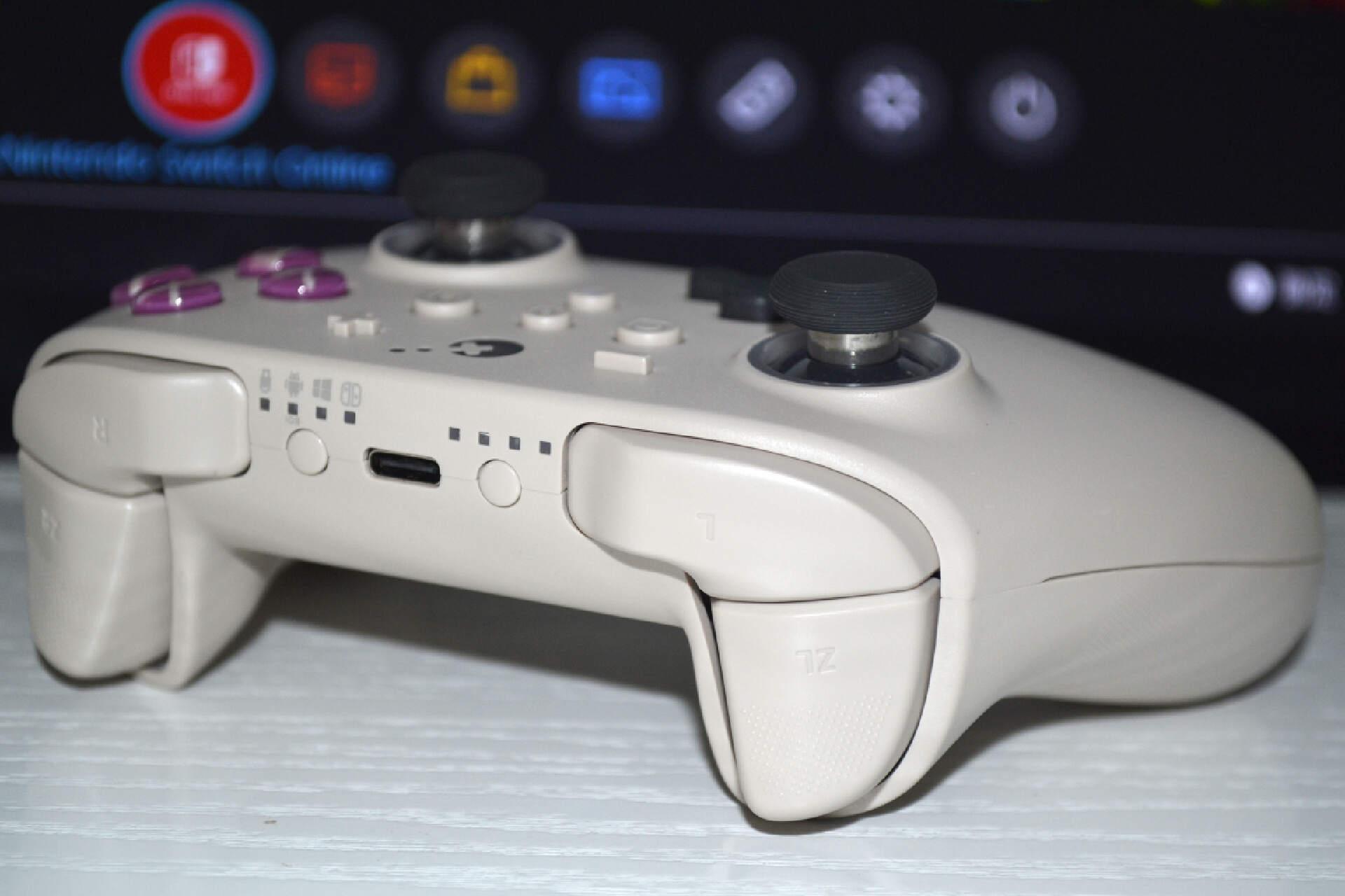 手柄整体形态遵循人体工程学,在长时间握持时也非常的舒适。手柄正面标志性的A、B、X、Y四键,采用SWITCH的布局方式。精准的十字键和两个灵敏的摇杆,优化用户的操控体验。