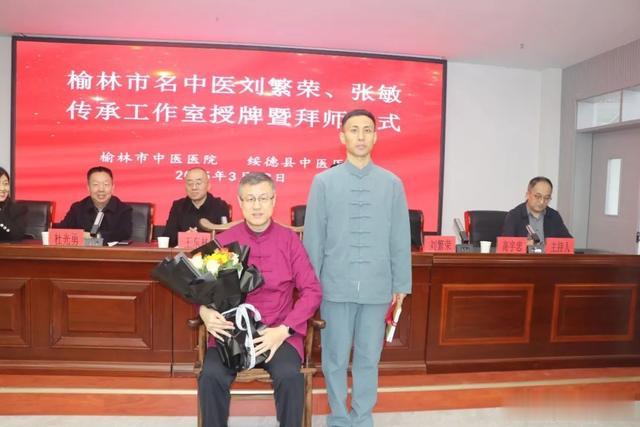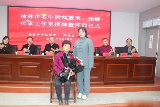 揭牌仪式后举行了拜师仪式。绥德县中医医院两位弟子向榆林市名中医、市中医医院副院长、肝胆脾胃病医院首席专家刘繁荣,榆林市名中医、肝胆脾胃病医院主任张敏行拜师礼、敬茶、献花。师父则回赠徒弟们中医经典书籍,寓意将中医智慧与责任传承给下一代。