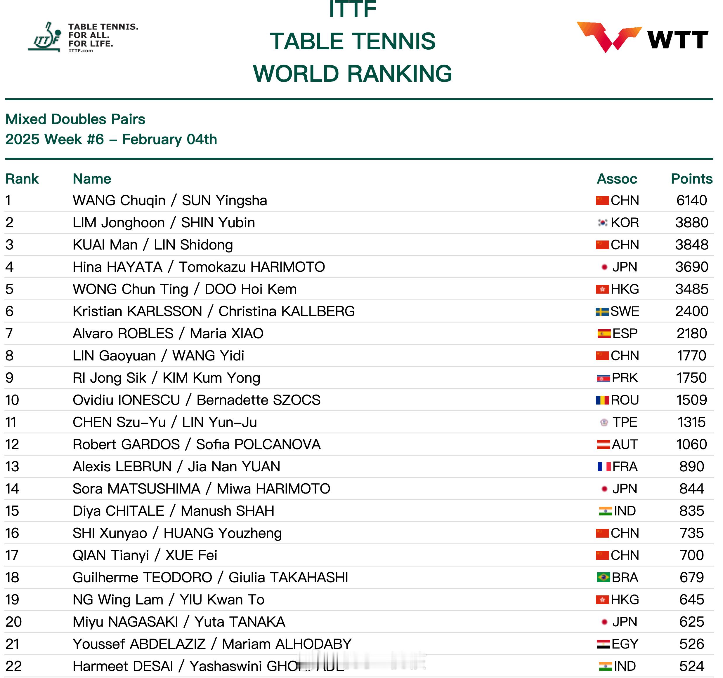 王楚钦/孙颖莎稳居混双第1,林钟勋/申裕斌紧随其后,蒯曼/林诗栋排名第3,早田希娜/张本智和、黄镇廷/杜凯琹排在4、5位。