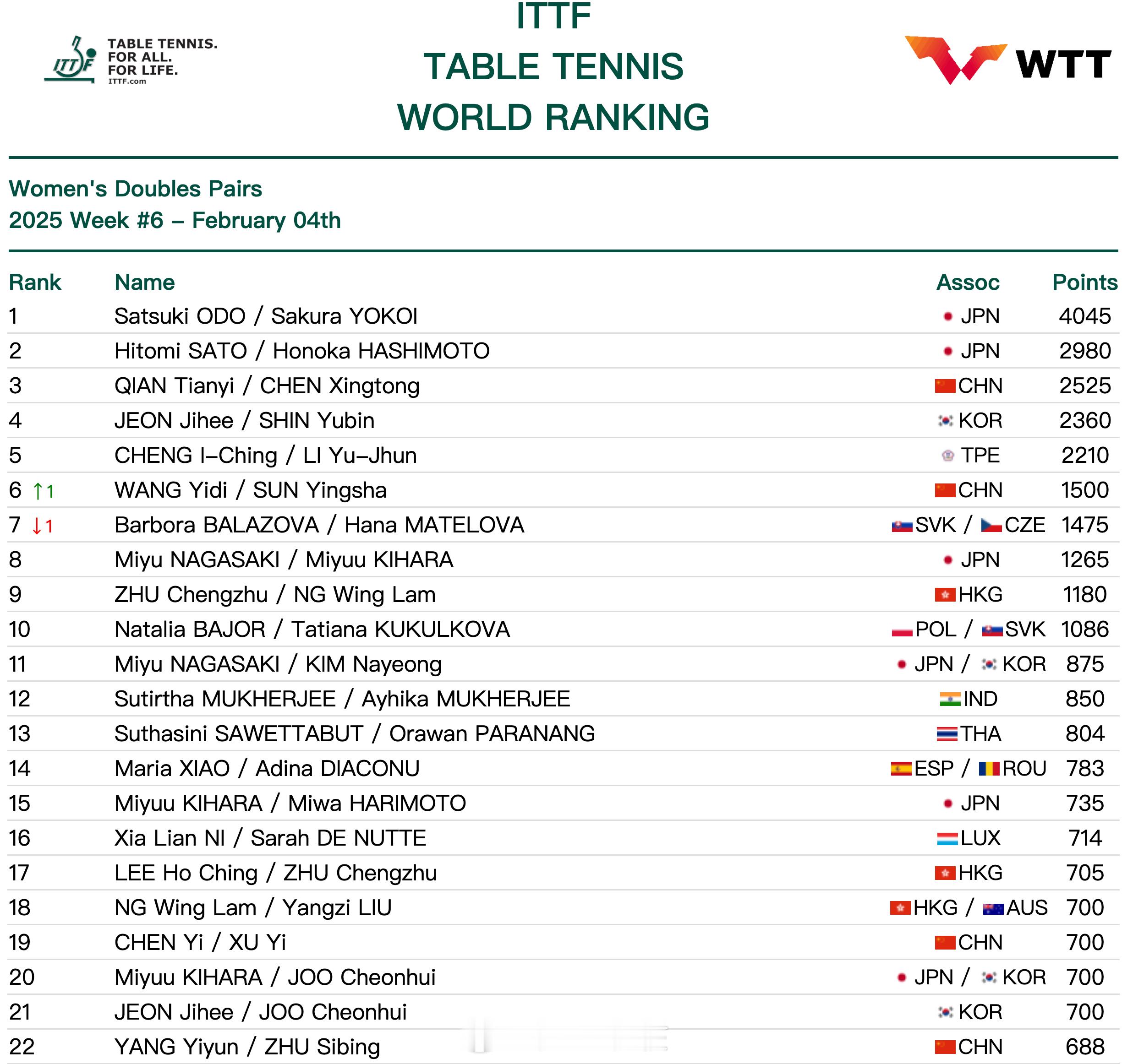 女双两对日本组合排在前两位,大藤沙月/横井咲樱、佐藤瞳/桥本帆乃香分列1、2位,钱天一/陈幸同排在第3,田志希/申裕斌第5,王艺迪/孙颖莎上升1位,暂列第6。