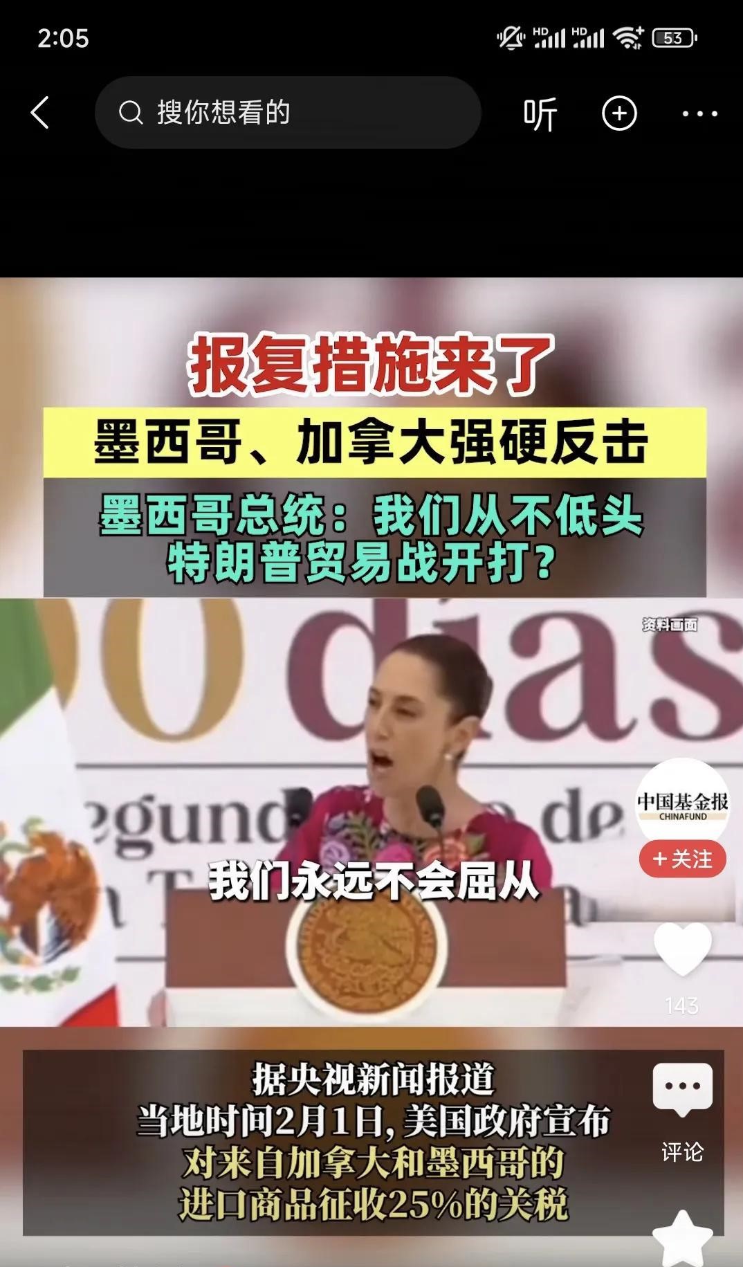 “三英战吕布”,加拿大、墨西哥、中国将硬刚美国! 美国如同三国时的吕布,战力榜排行第一,单打独斗谁都不好赢他。 现在既然要与三国同时开战,那么横竖都是死棋,不如绝地反击,联起手来。刘、关、张虽然一个敌不过吕布,三个人合力还是有战胜他的可能。 现在特朗普已签署命令,2月1日起对三国开战,那么三国也已抛弃幻想,着手战斗。 其一,加拿大已冲到阵前,总理特鲁多宣布对价值1550亿加元(约合1067亿美元)的美国商品征收25%的关税; 其二,墨西哥已准备出手,总统已经指示墨西哥经济部长埃布拉德启用墨西哥政府此前准备的“B计划”,向美国输墨产品加征关税。 其三,中方严阵以待。中方多次表明了立场,始终认为贸易战、关税战没有赢家。对于美方的错误做法,中方将向世贸组织提起诉讼,并将采取相应反制措施坚定维护自身权益。 这次三英战吕布,孰输孰赢,就要比耐力和意志了!