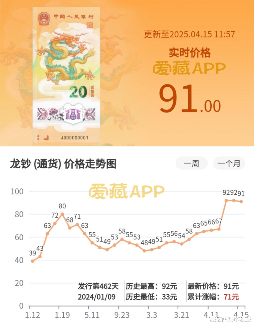 这一天的价格上涨幅度也是比较的大,当然跟2024年龙年纪念钞近段时间的涨幅进行对比,其实整体涨幅差距还是比较大。2024年龙年纪念钞的市场行情,从60多元左右一路上涨到接近100元的市场行情,也就用了三天时间,目前2024年龙年纪念钞散钞的市场行情基本上可以快接近90元左右,标准十连目前整体市场行情在92~100元左右。