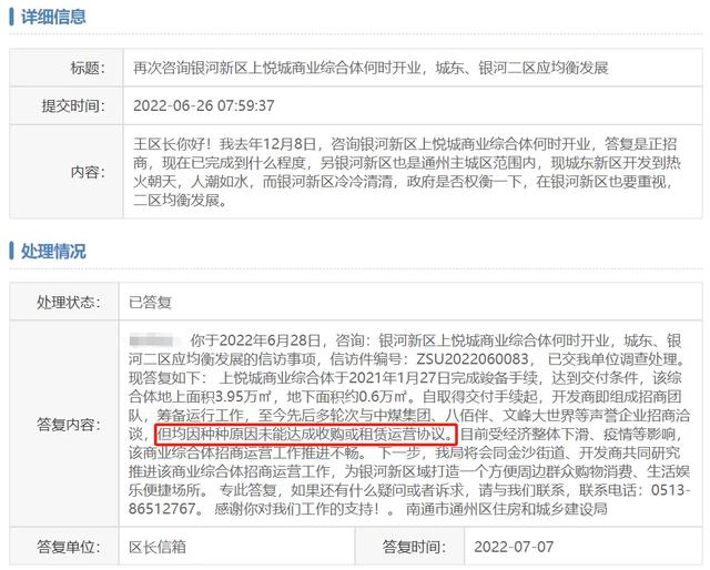● 2022年7月,仅仅隔了一个月,通州区住房和城乡建设局在回复网友时又提到:至今先后多轮次与中煤集团、八佰伴、文峰大世界等声誉企业招商洽谈,但均因种种原因未能达成收购或租赁运营协议。