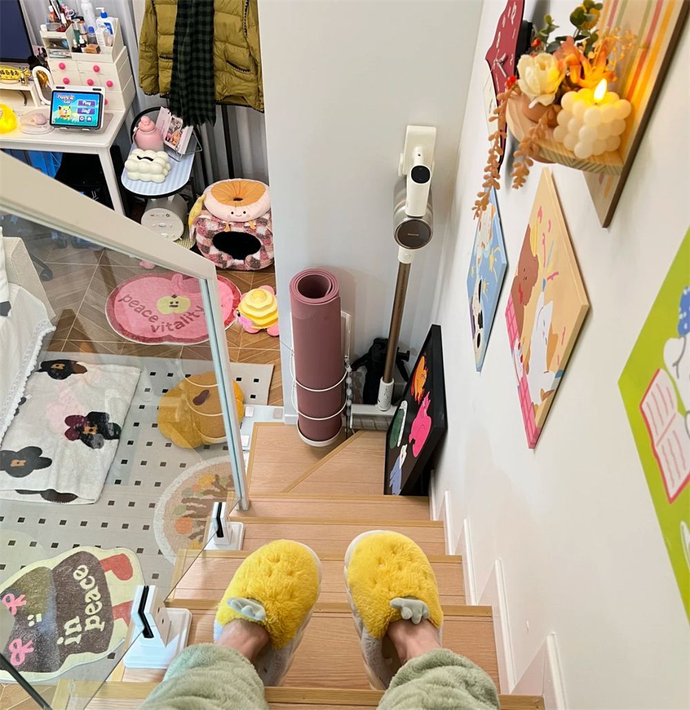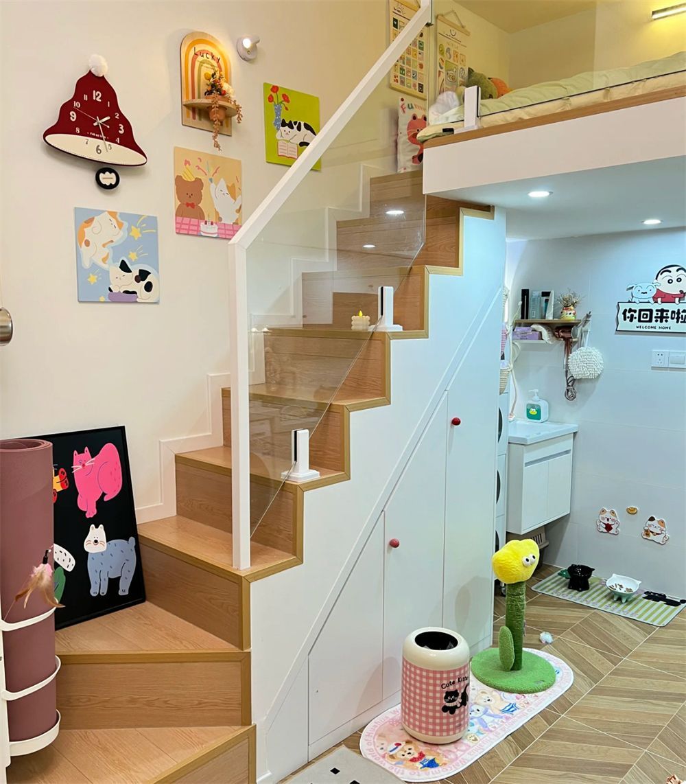 楼梯间部分墙上挂画,下面做成三门收纳柜,既可以隐藏收纳家中的各类杂物和生活用品,又能为单调的空间起到装饰作用,向上的楼梯就像一个微缩的画廊,构建起了属于这位姑娘可爱的小小“城堡”角落。