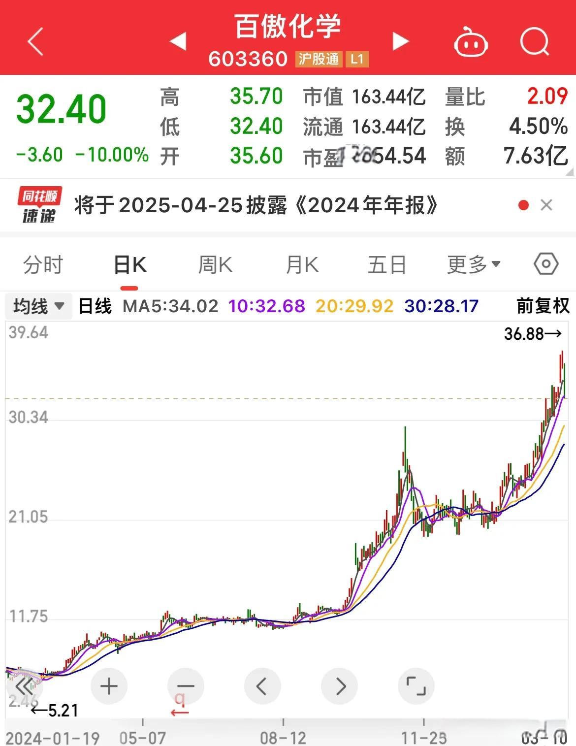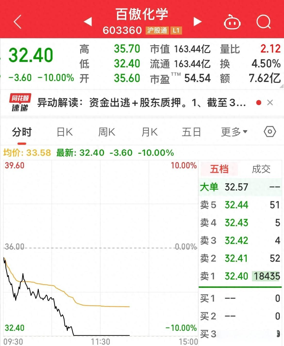 百傲化学在交易量放大后无力继续冲刺,今天终于低开低走闪崩跌停了,这种高位股什么时候跌停都不奇怪,奇怪是还有投资者去博短线,虽然这样的投资者不多,但因为你们的参与,才出现了这种反常的走势。