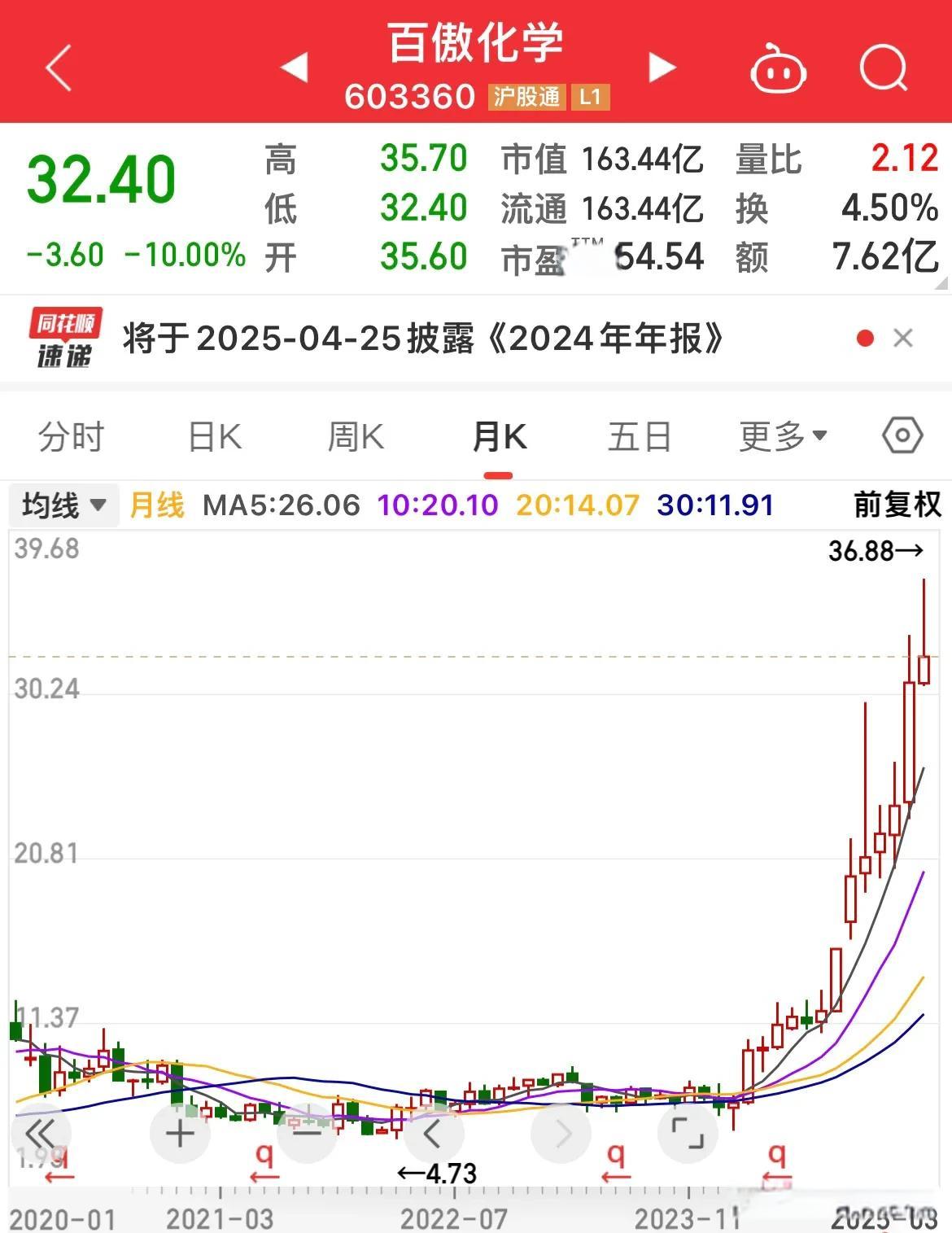 百傲化学,一家生产杀虫剂的企业,去年此时的估计才5.21,而今年此时的高点已到36.88,涨幅620%,年内12个月仅有一个月下跌,其它11个月都是上涨。