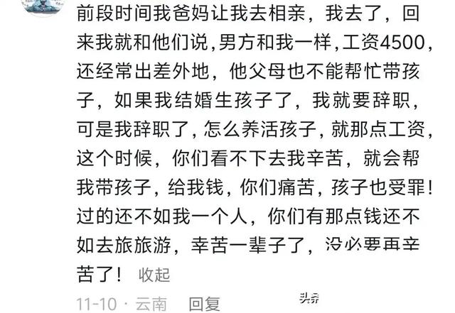 为什么年轻人不愿意生孩子,许多专家批评年轻人不愿意生孩子,不负责任,推卸责任,导致人口减少。但知道原因的人却很少。年轻人其实不是不想生,而是觉得生不出幸福来。专家听到肯定又要说年轻人败家,不知道拼搏奋斗,不进取,不努力。其实年轻人自己知道自己的心境,也知道自己为啥不想生。评论区绝大多数网友都看到,是没钱才不敢生的。养孩子是大事,花钱又费心。遇到事情要想办法解决,还要有人看护。很多已婚女性都有体会。生个孩子就要耽误几年时间。女人一辈子也就那么点光阴。生孩子还要遭罪。不仅仅是花钱的事。生活的重担压在年轻人的身上,苦出了一种境界,都不知道如何活了。身体上的痛苦和精神上的痛苦双重折磨着年轻人。原生家庭给孩子留下了很多烂摊子。孩子生下来要背负很多包袱。选择不生孩子,有时候是一种善良,一种责任。很多时候,大家说的对,对不起这个社会,对不起那些期待你来到的人。但是归根结底,还是钱的问题。很多人活得很艰难,结了婚自由了,没事花钱都很难。想给自己买件心仪的东西都很难。想给家人朋友买点东西都很难。给孩子花钱,那简直是不敢想象的事情。大家怎么看的呢?@平凡的世界2810