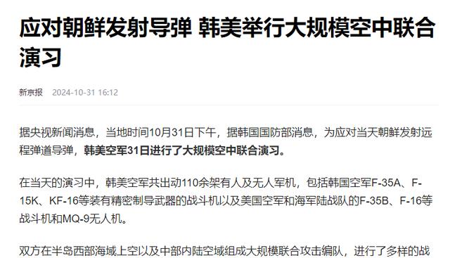 新京报 2024-10-31 应对朝鲜发射导弹 韩美举行大规模空中联合演习