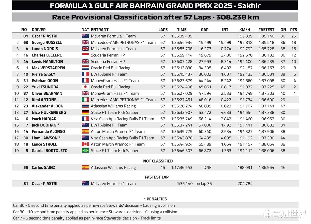 皮亚斯特里自身虽也遇到饮水系统问题,但仍以15.499秒的大差距夺下本赛季第2胜,拉塞尔虽抵挡住诺里斯的攻势,但能否守住第二仍得依据赛后调查结果而定。