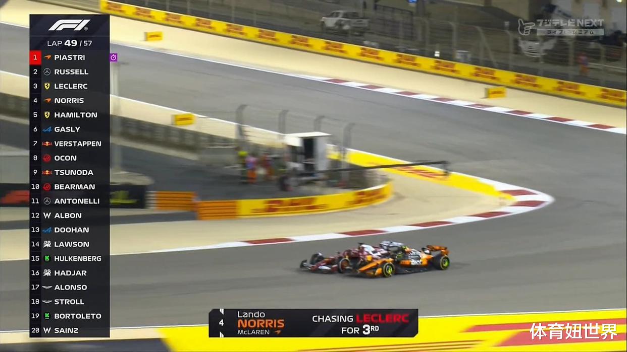 相较于强势的皮亚斯特里,完全陷入挣扎状态的维斯塔潘除了无法超越奥康外,更在第20圈起的3圈时间接连被安东内利与汉密尔顿超越,而且红军正藉着轮胎优势展开追击:除了汉密尔顿在第23与第26圈接连超越安东内利与奥康外,勒克莱尔也与诺里斯展开激烈攻防战。
