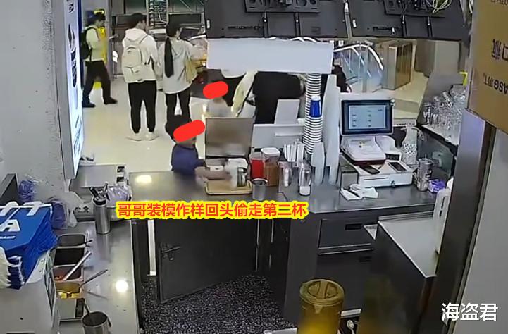 随后哥哥又装模作样地回来,又趁人不备将手伸到柜台后面,拿走了另外一杯奶茶。