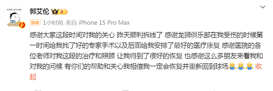 感谢大家这段时间对我的关心,昨天顺利拆线了,感谢龙狮俱乐部在我受伤的时候第一时间给我找了好的专家手术以及后面给我安排了最好的医疗康复,感谢医院的各位老师对我这段的治疗和照顾,让我得到了很好的恢复,也感谢这么多朋友来看我和对我的问候,有你们的帮助和关心我相信我一定会恢复并重新回到球场。